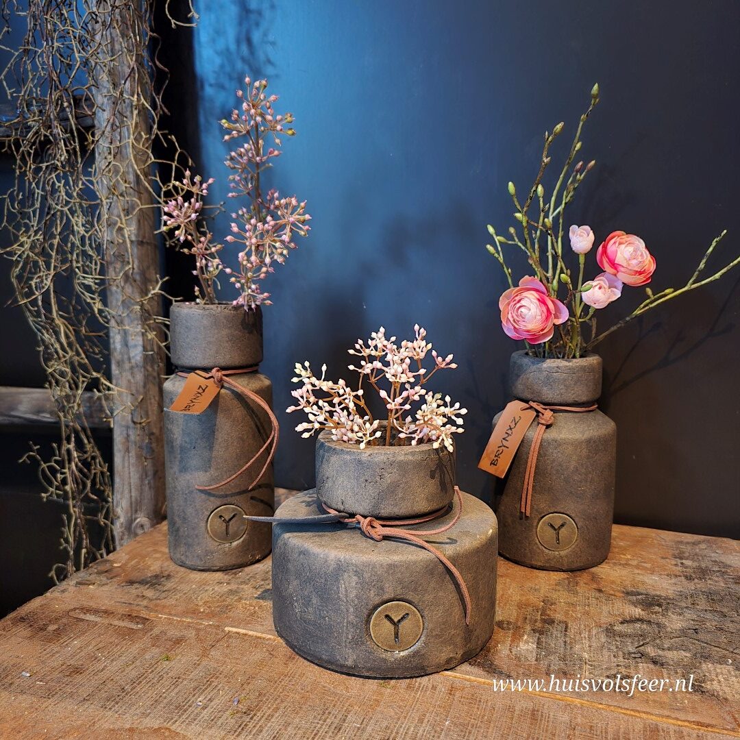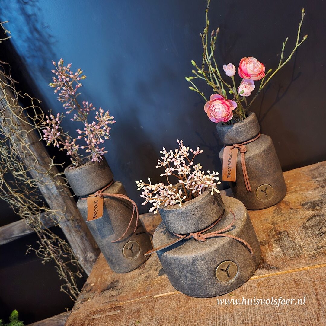 Stoere set van 3 vaasjes uit de Brynxz collectie in de kleur Majestic Brown. De vazen zijn afgewerkt met een leren touw en het kenmerkende Brynxz label, wat zorgt voor een robuuste en sfeervolle uitstraling.