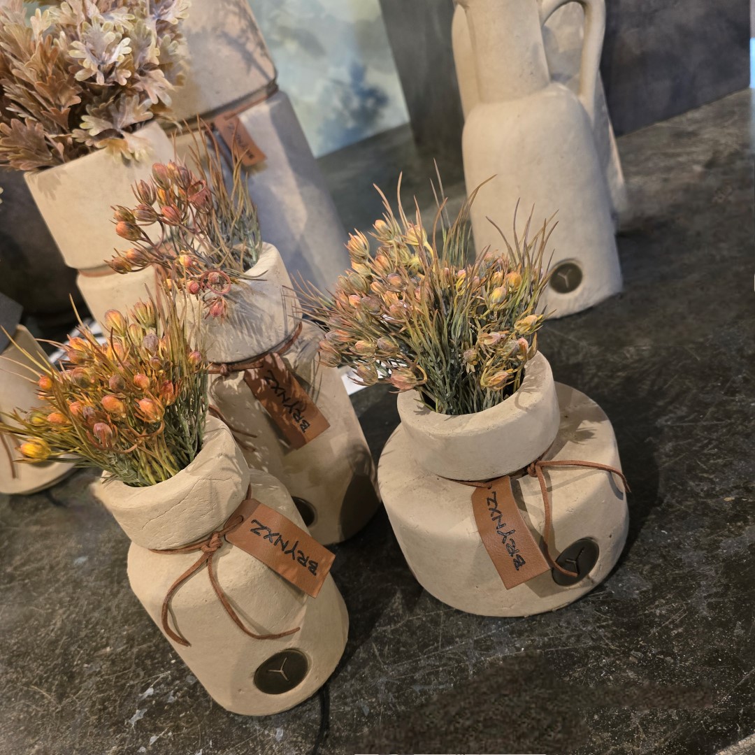 Stoere set van 3 vaasjes uit de Brynxz collectie in de kleur Majestic Taupe. De vazen zijn afgewerkt met een leren touw en het kenmerkende Brynxz label, wat zorgt voor een robuuste en sfeervolle uitstraling.