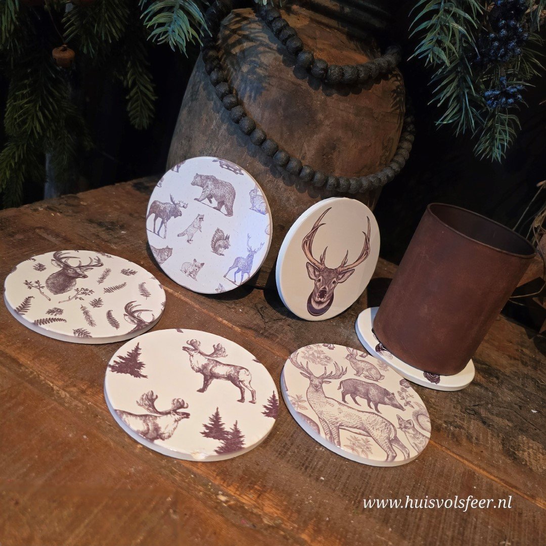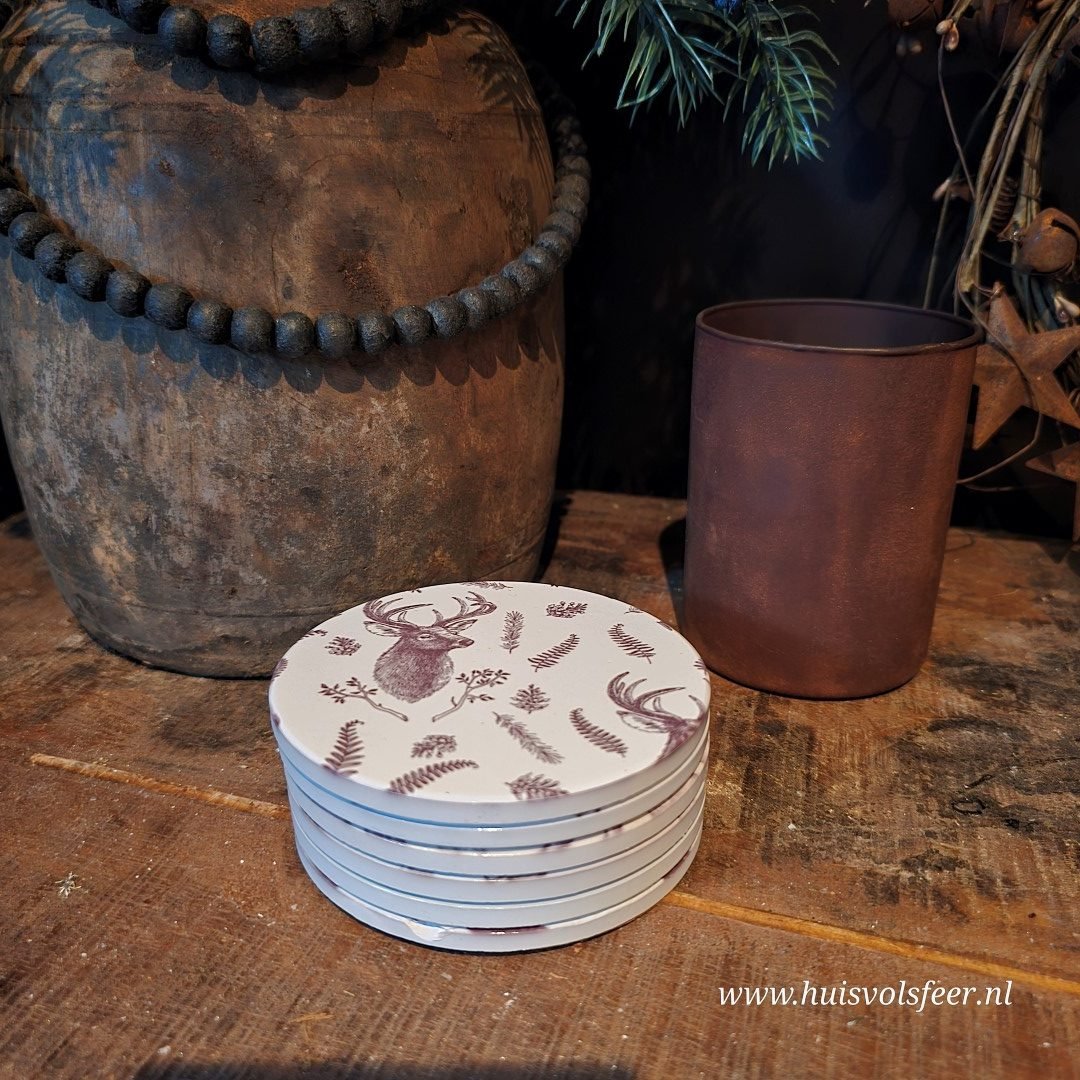 Voeg een sfeervol accent toe aan je landelijke interieur met deze set van 6 unieke keramieken onderzetters.