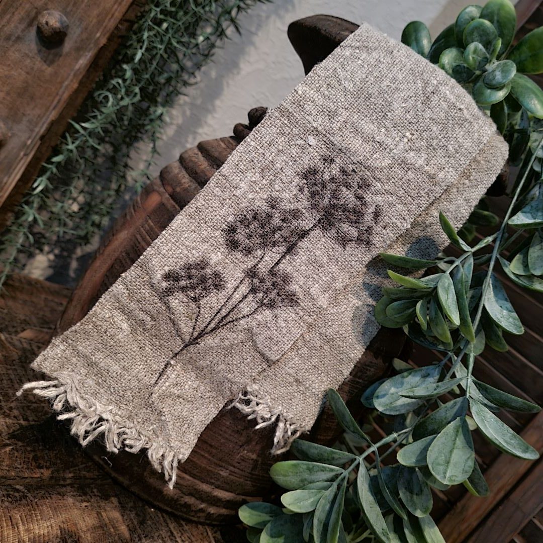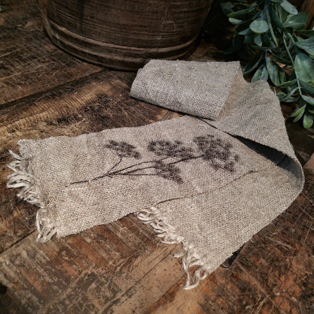 Linnen shabby lint/ tafelloper/ slinger. Het lint heeft aan 1 zijde een print van een berenklauw. Het lintje heeft een gerafelde rand.