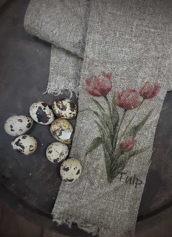 Linnen shabby lint/ tafelloper/ slinger. Het lint heeft aan 1 zijde een print van tulpjes. Het lintje heeft een gerafelde rand.