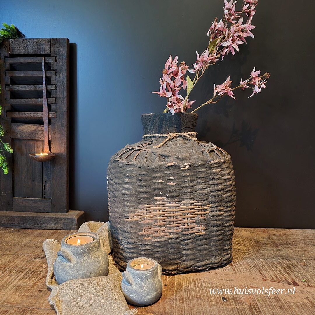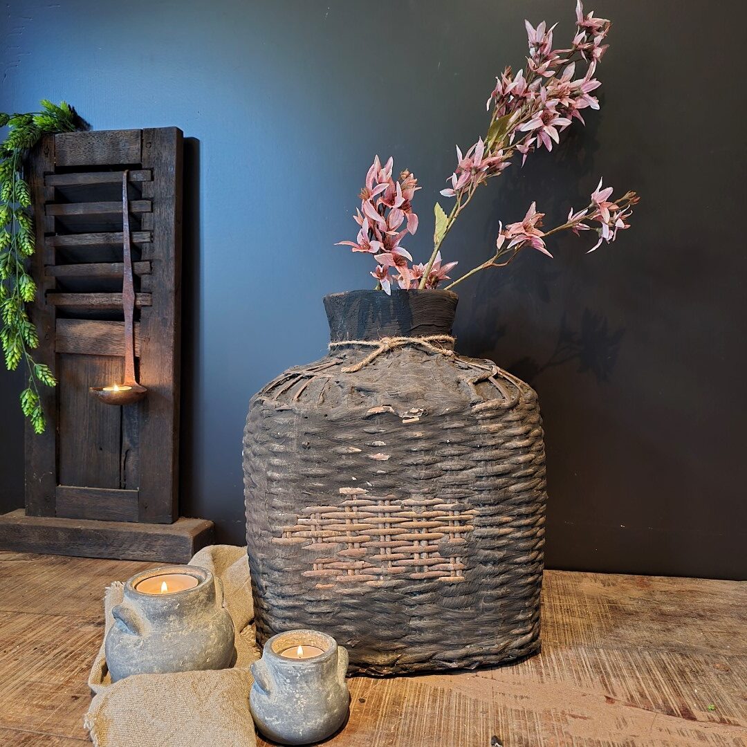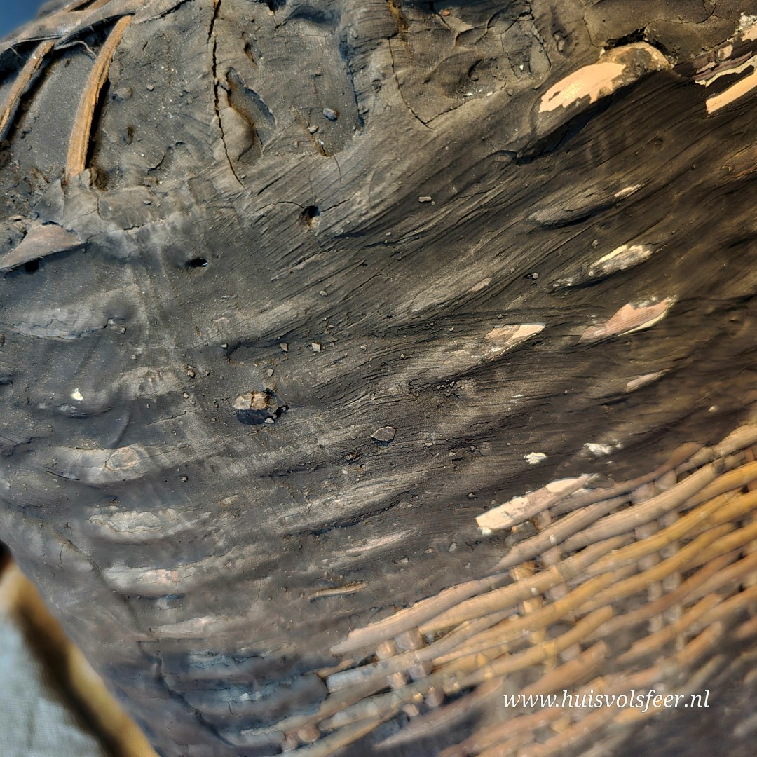 Deze robuuste leemmand / leempot is een bijzonder en karaktervol item met een pure, doorleefde uitstraling. Het object is vervaardigd van steen en klei en afgewerkt met rotan, waarbij het handwerk en de natuurlijke materialen duidelijk zichtbaar zijn. De combinatie van verweerde leemstructuren en het rotan vlechtwerk zorgt voor een unieke, stoere en landelijke uitstraling.