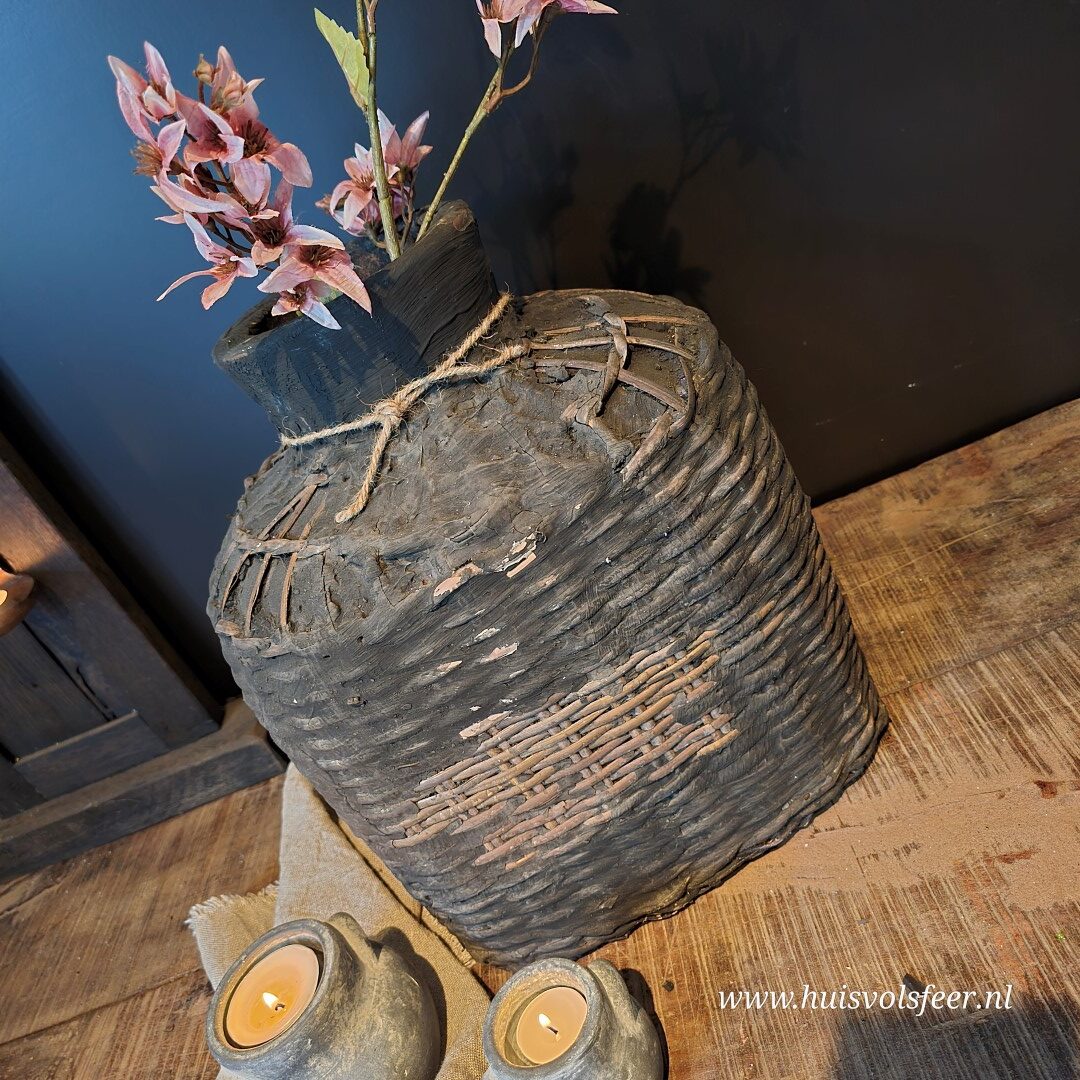 Prachtig als grote sobere pot op een kast, tafel of vloer, met bijvoorbeeld takken, zijden bloemen of groen. Ook zonder decoratie is dit object al een echte blikvanger dankzij de rijke textuur en natuurlijke uitstraling. Mooi te combineren met een toef of een groene hanger voor een extra natuurlijk accent.