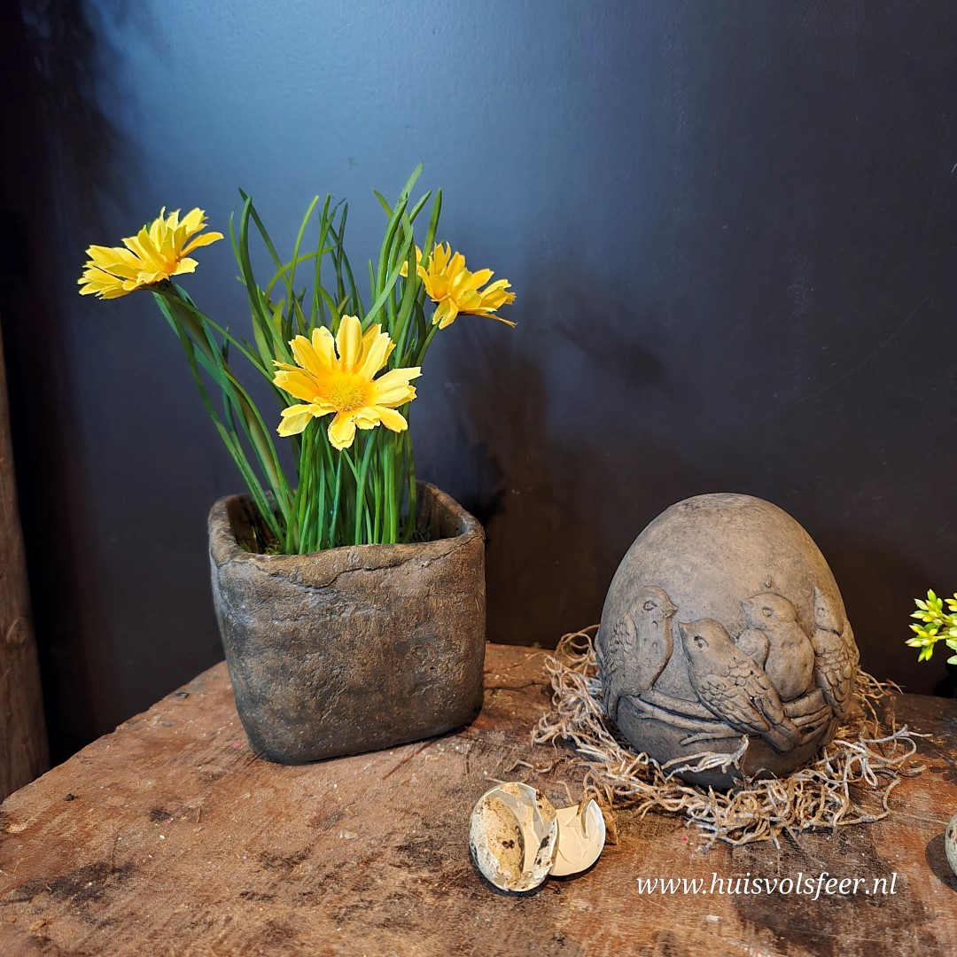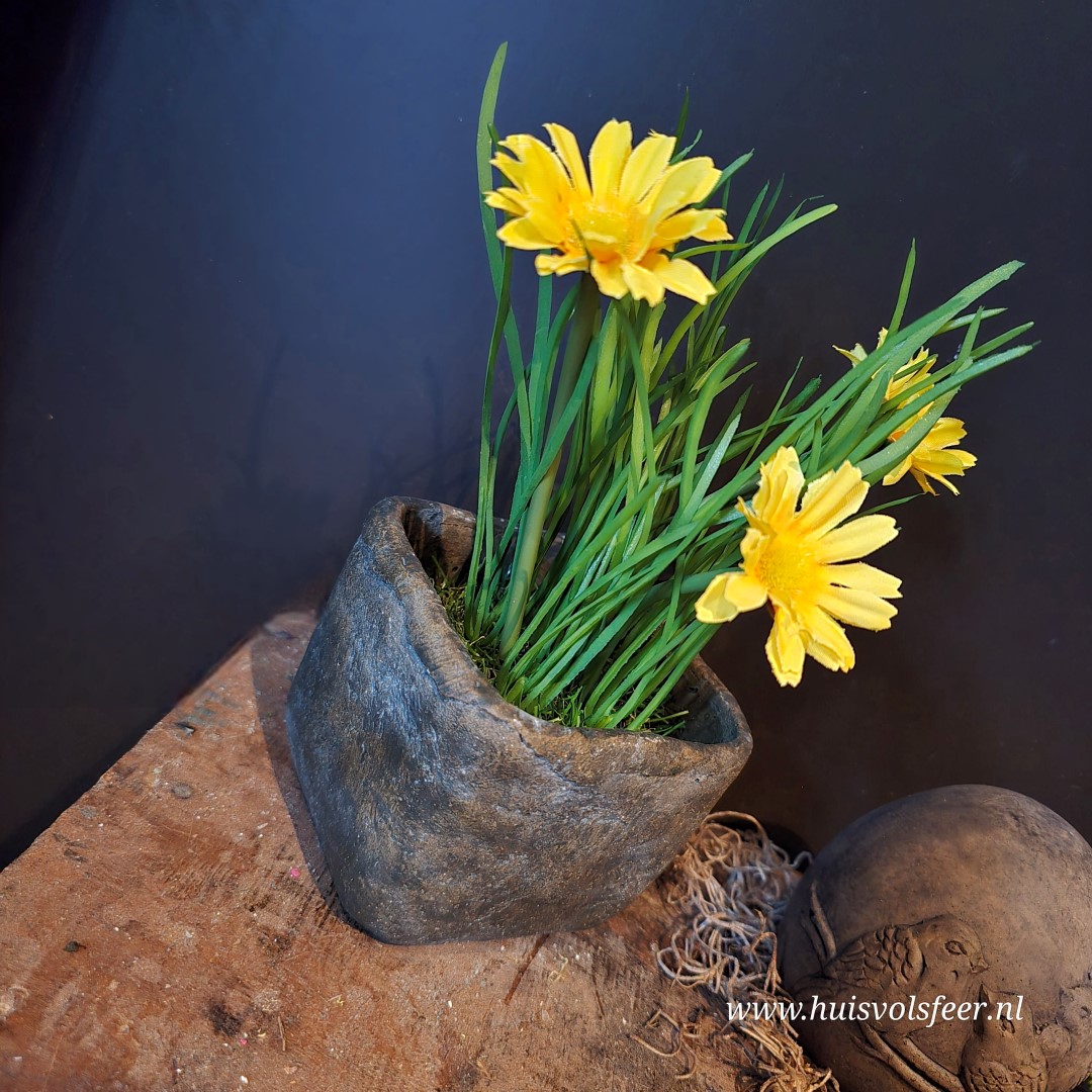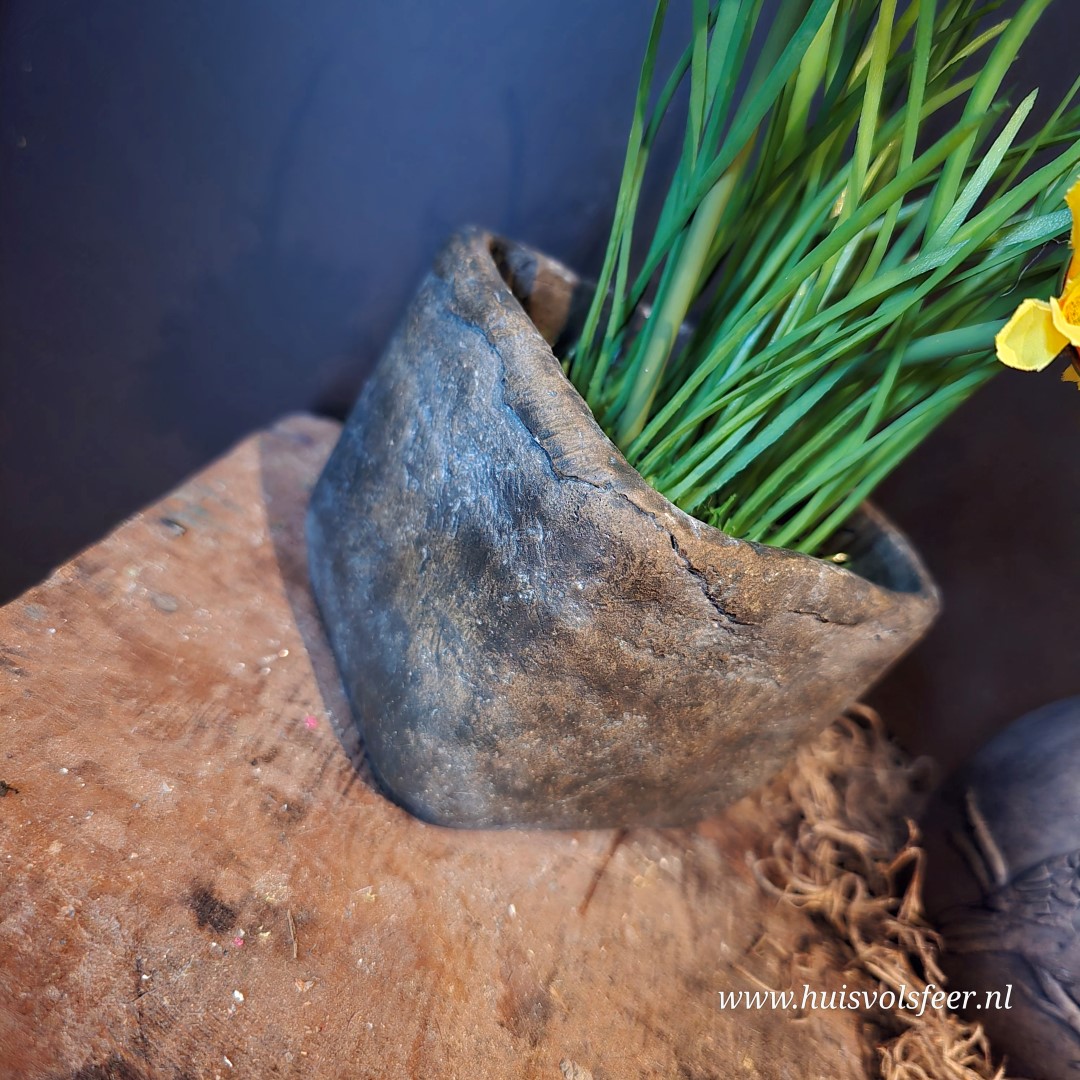 Deze stenen bloempot met vierkant model heeft een stoere en natuurlijke uitstraling. De warme grijs-bruine tint en de robuuste structuur geven de pot een tijdloos karakter dat perfect past binnen een sfeervol en landelijk interieur.