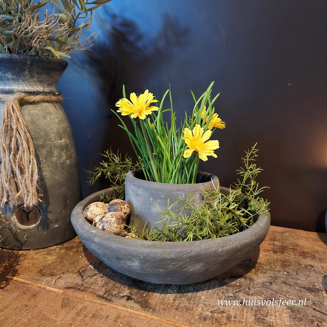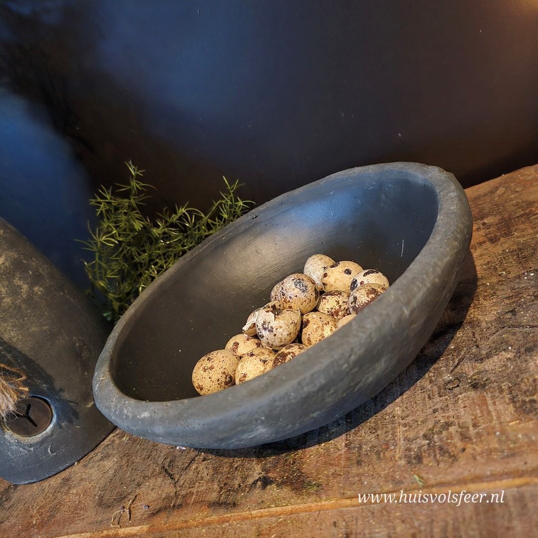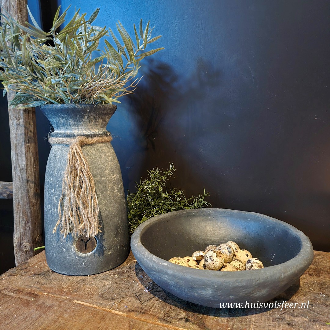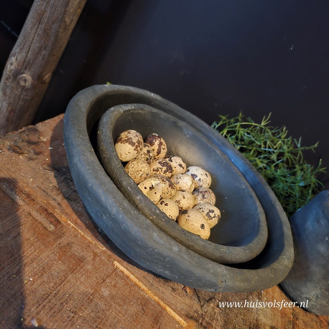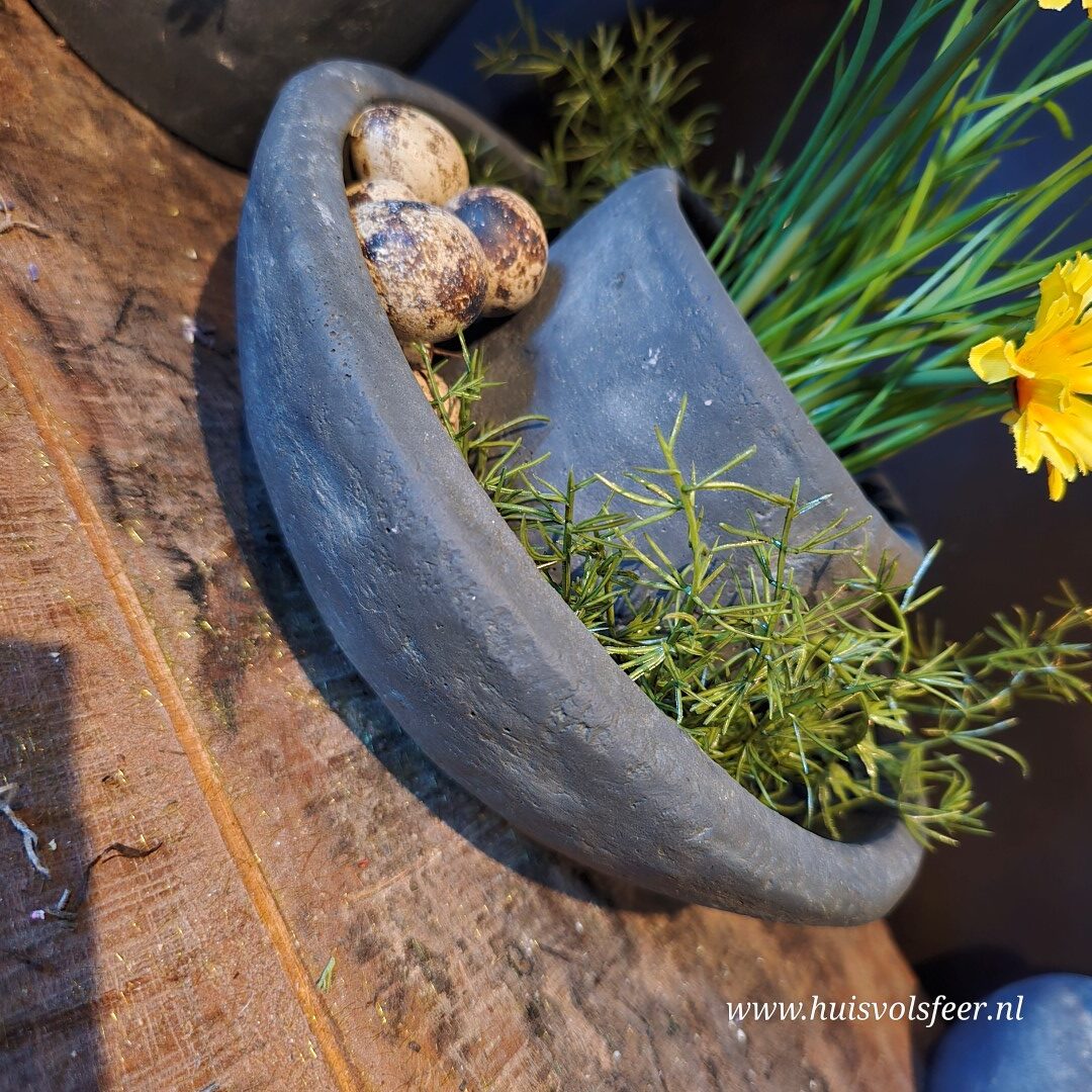 Deze stenen schaal in antraciet is een echte blikvanger door zijn robuuste vorm en grotere formaat. Ideaal voor het maken van een sfeervol decoratiestuk met bijvoorbeeld groen, seizoensdecoratie of een landelijke styling.