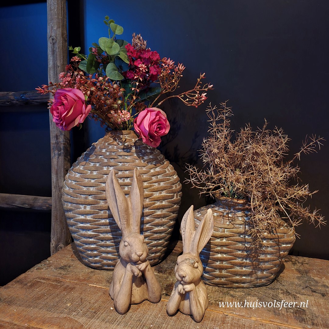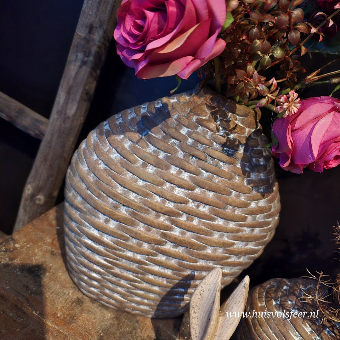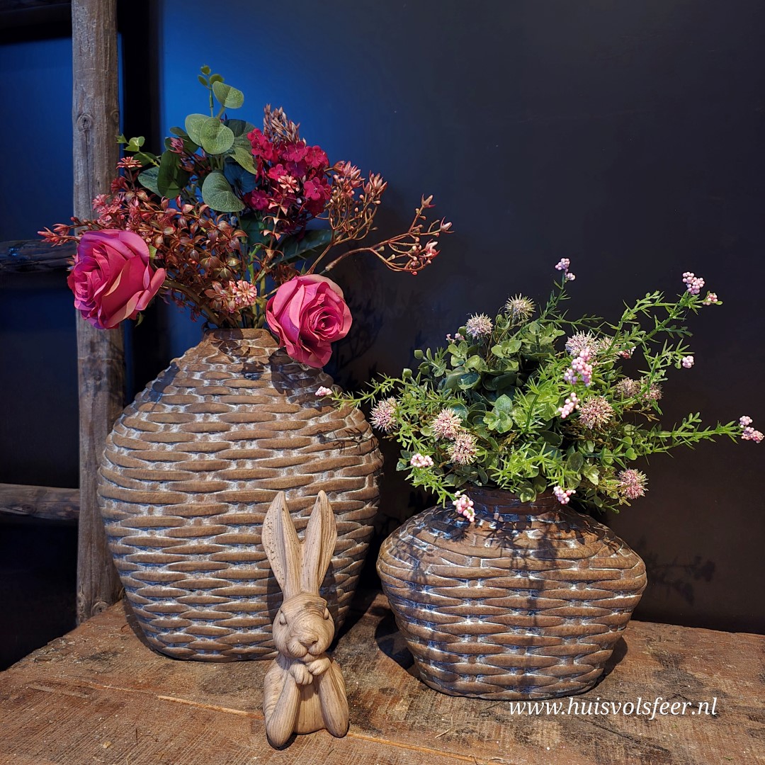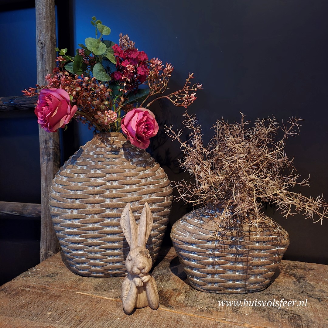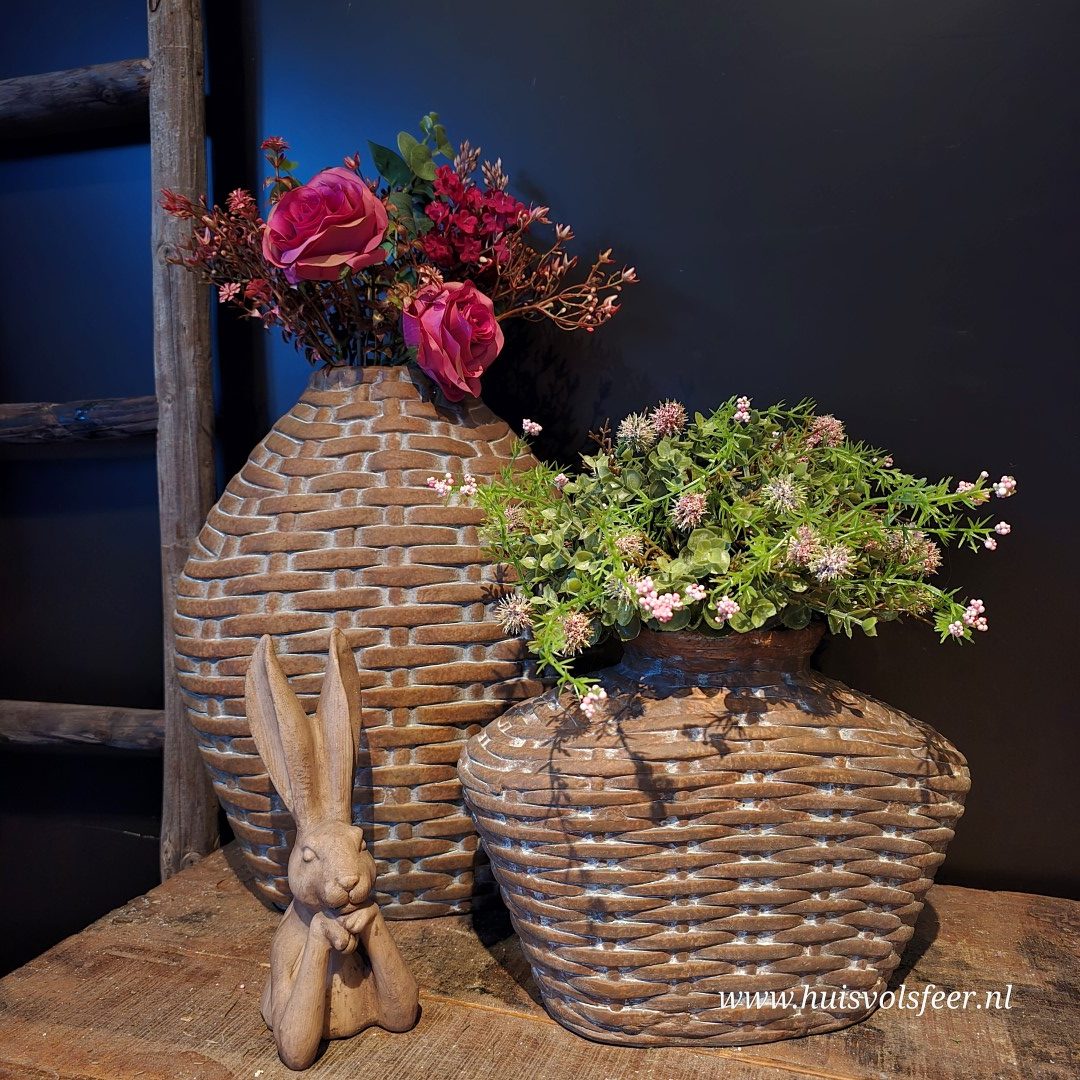 Deze ovale stenen vaas combineert een zachte vorm met een stoere leemmand look. De grijs-bruine kleur en het verweerde oppervlak geven de vaas een rustige, natuurlijke uitstraling die perfect past binnen een landelijk of sober interieur.