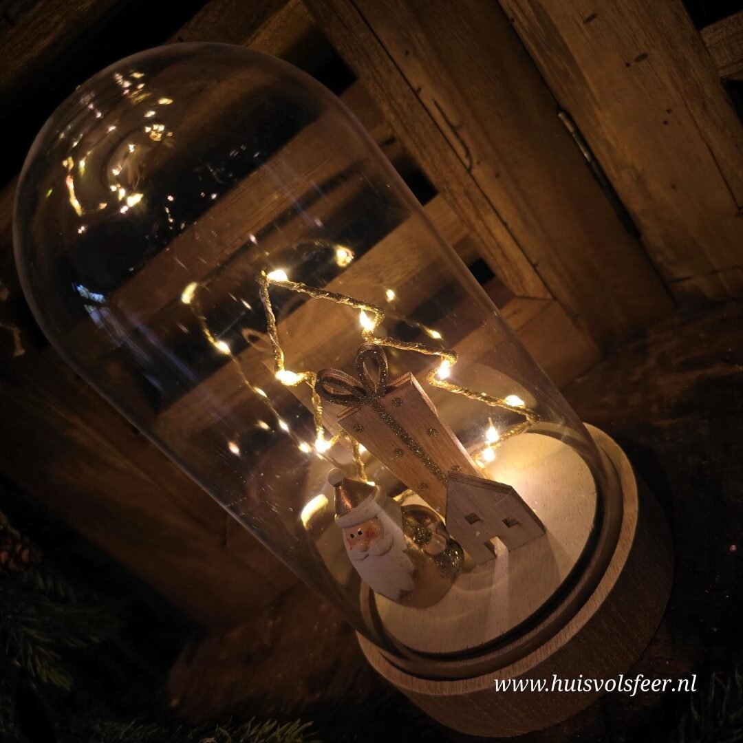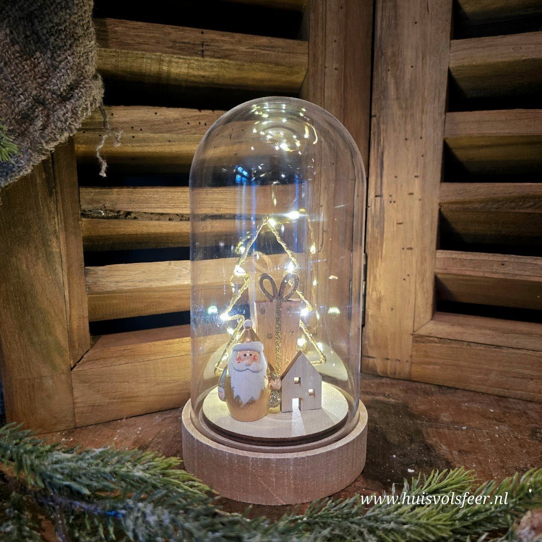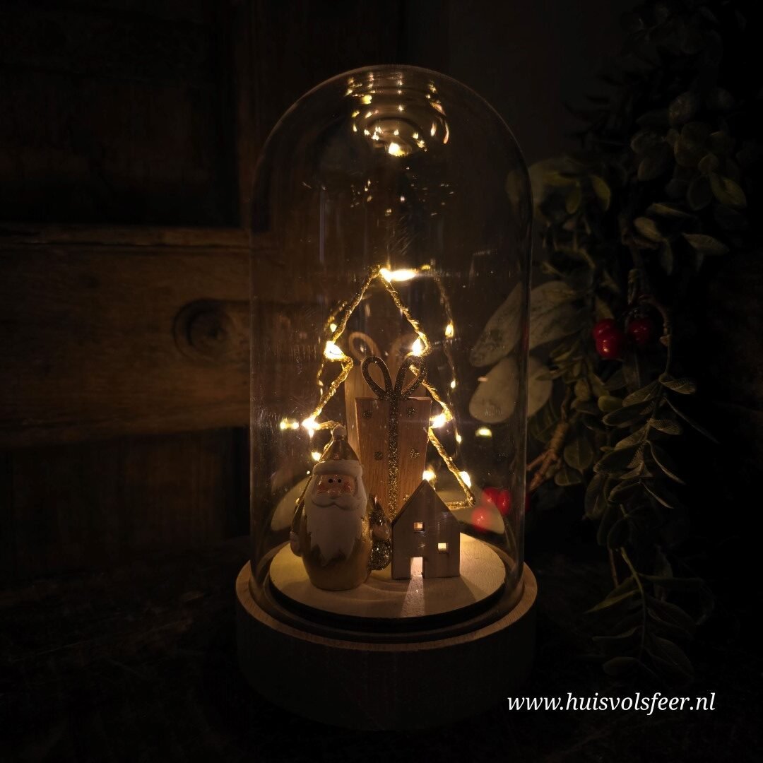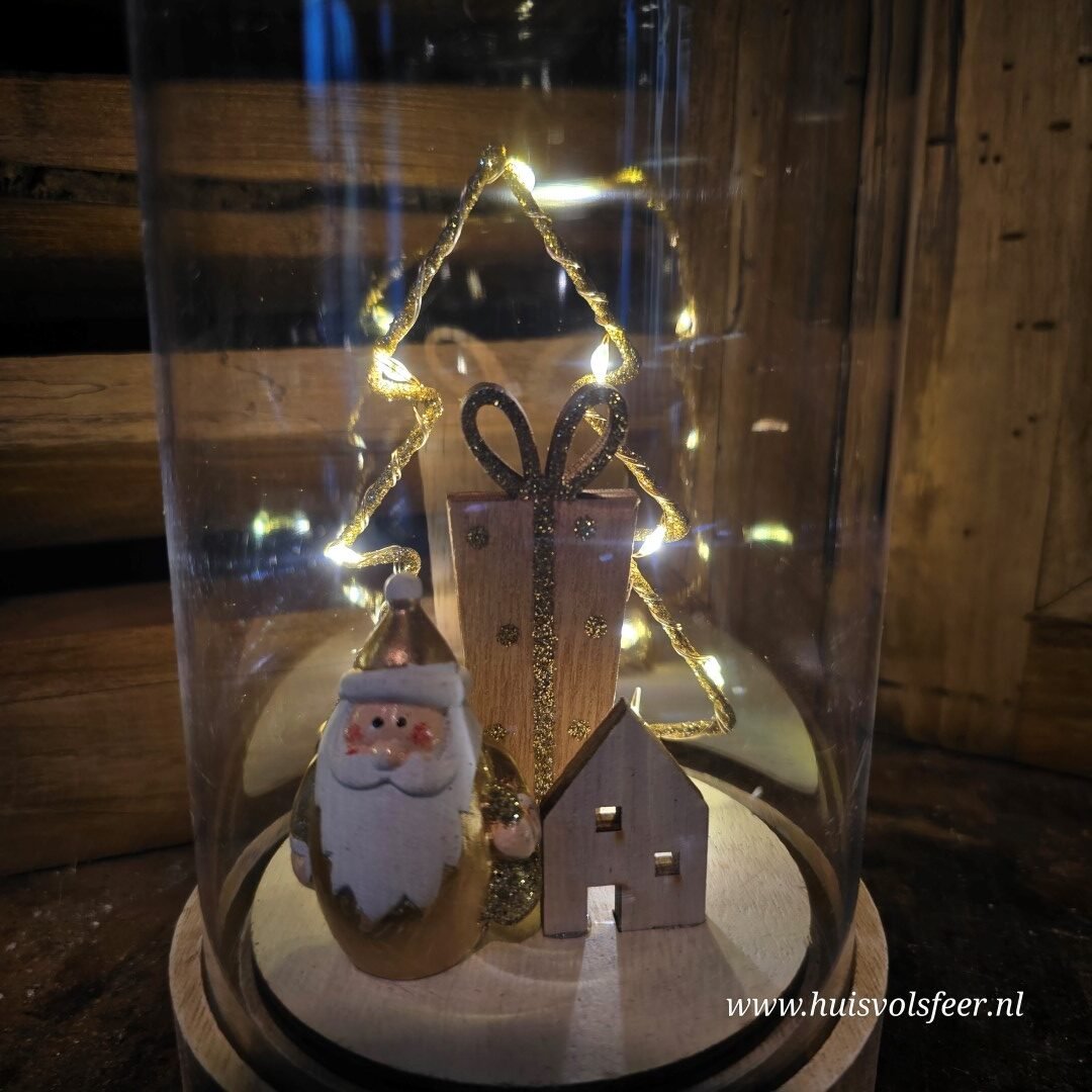 Mooi stolp met binnenin een Kerstman, kerstboom, huisje en cadeau.