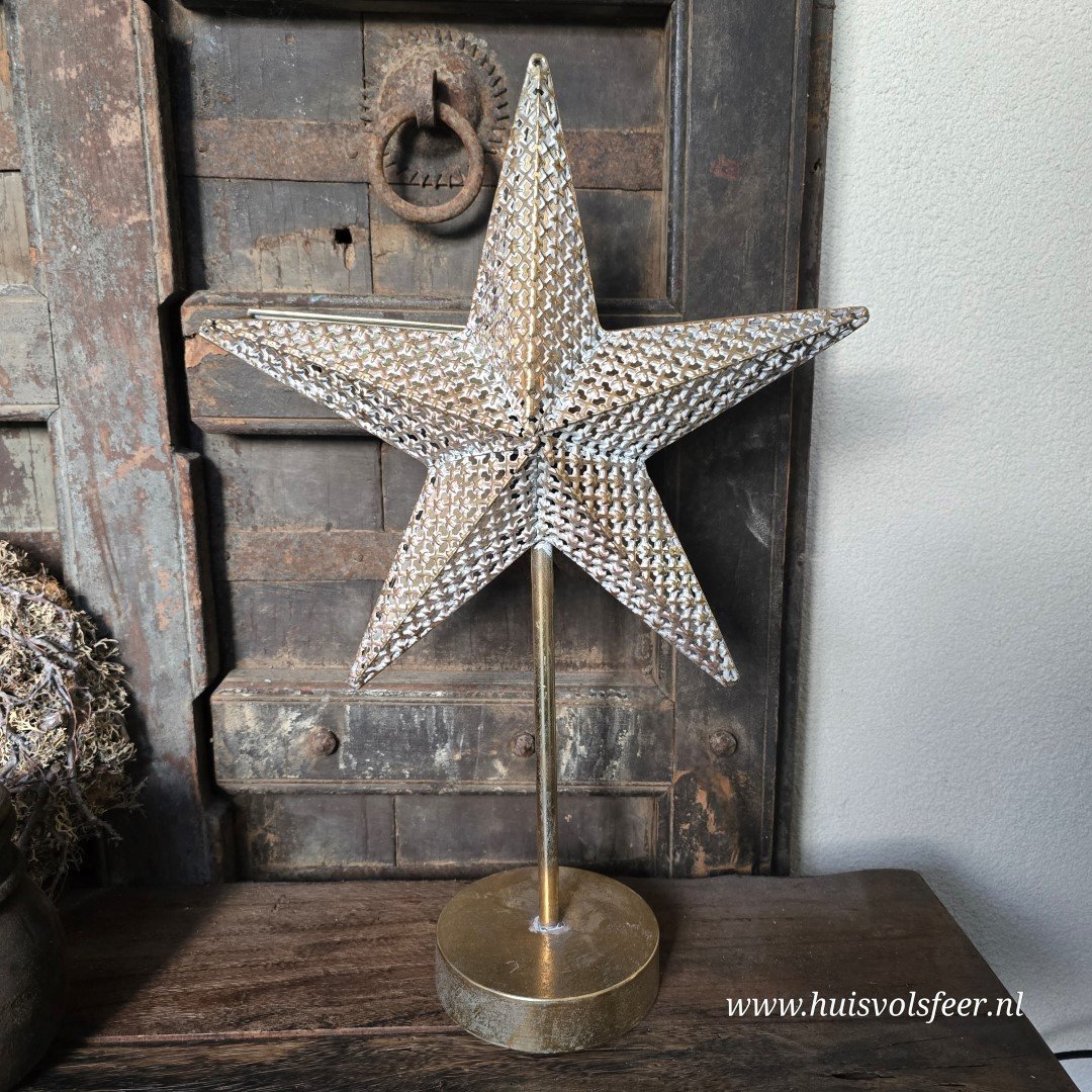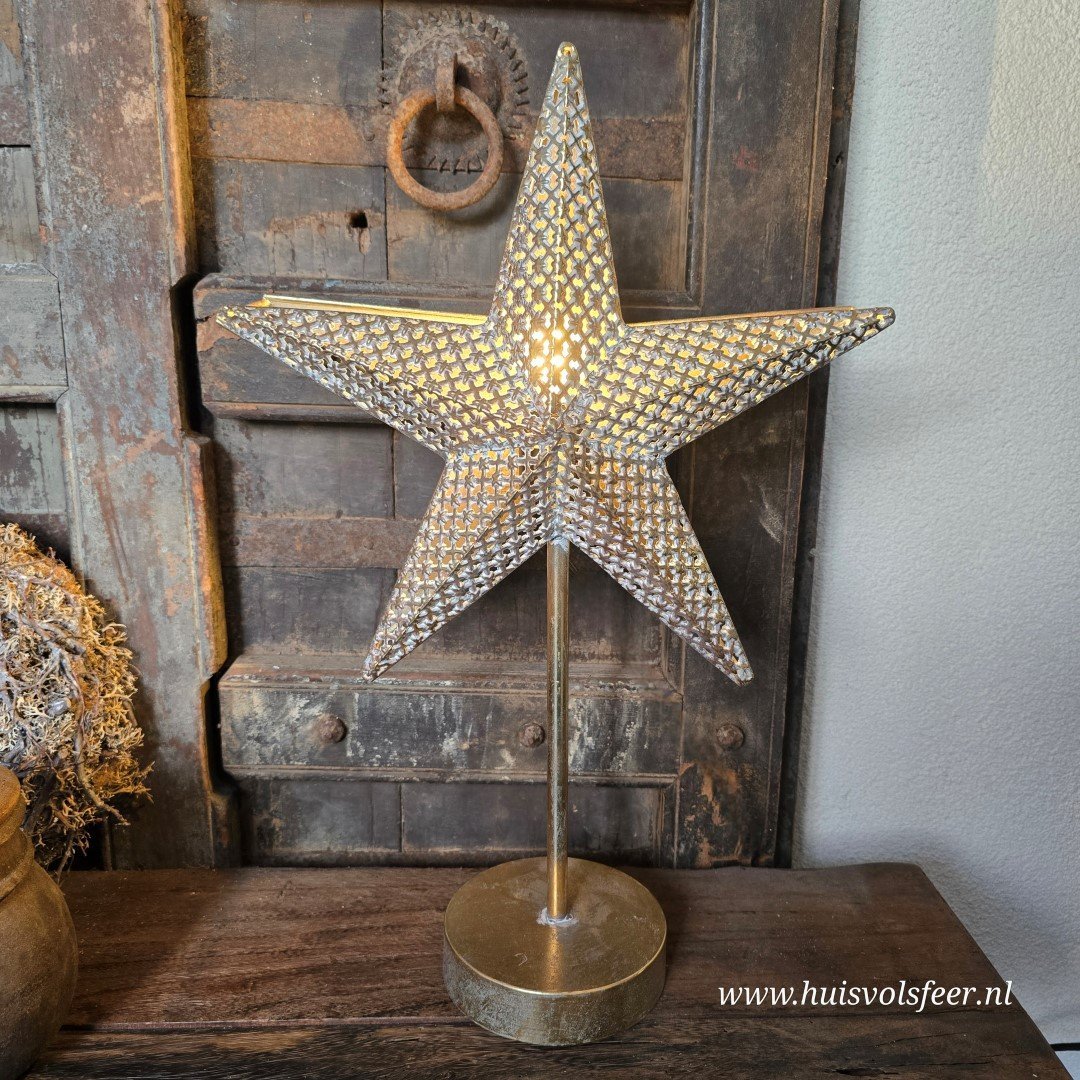 Metalen tafellamp in warme goud kleur in de vorm van een ster.