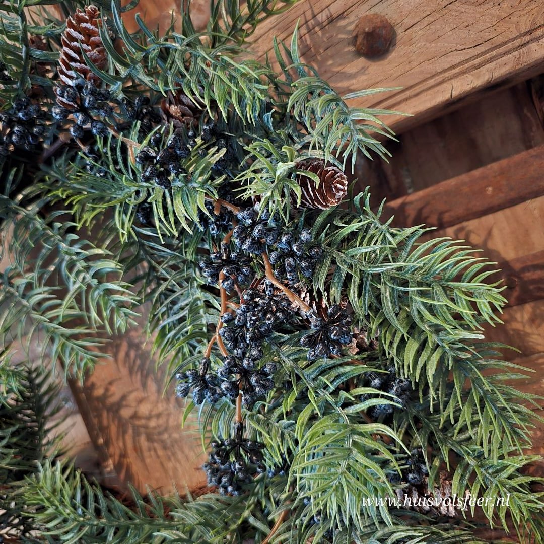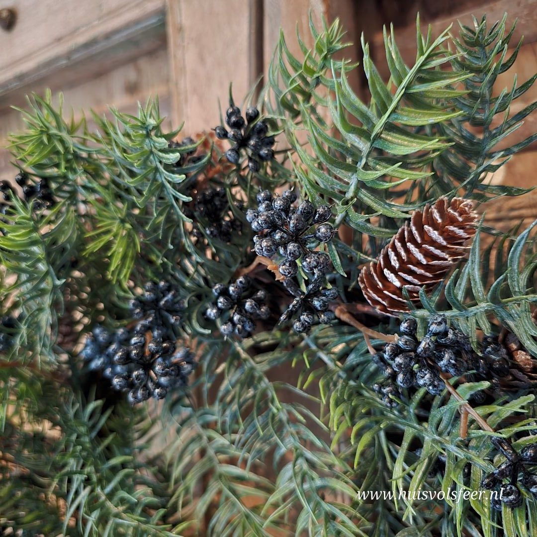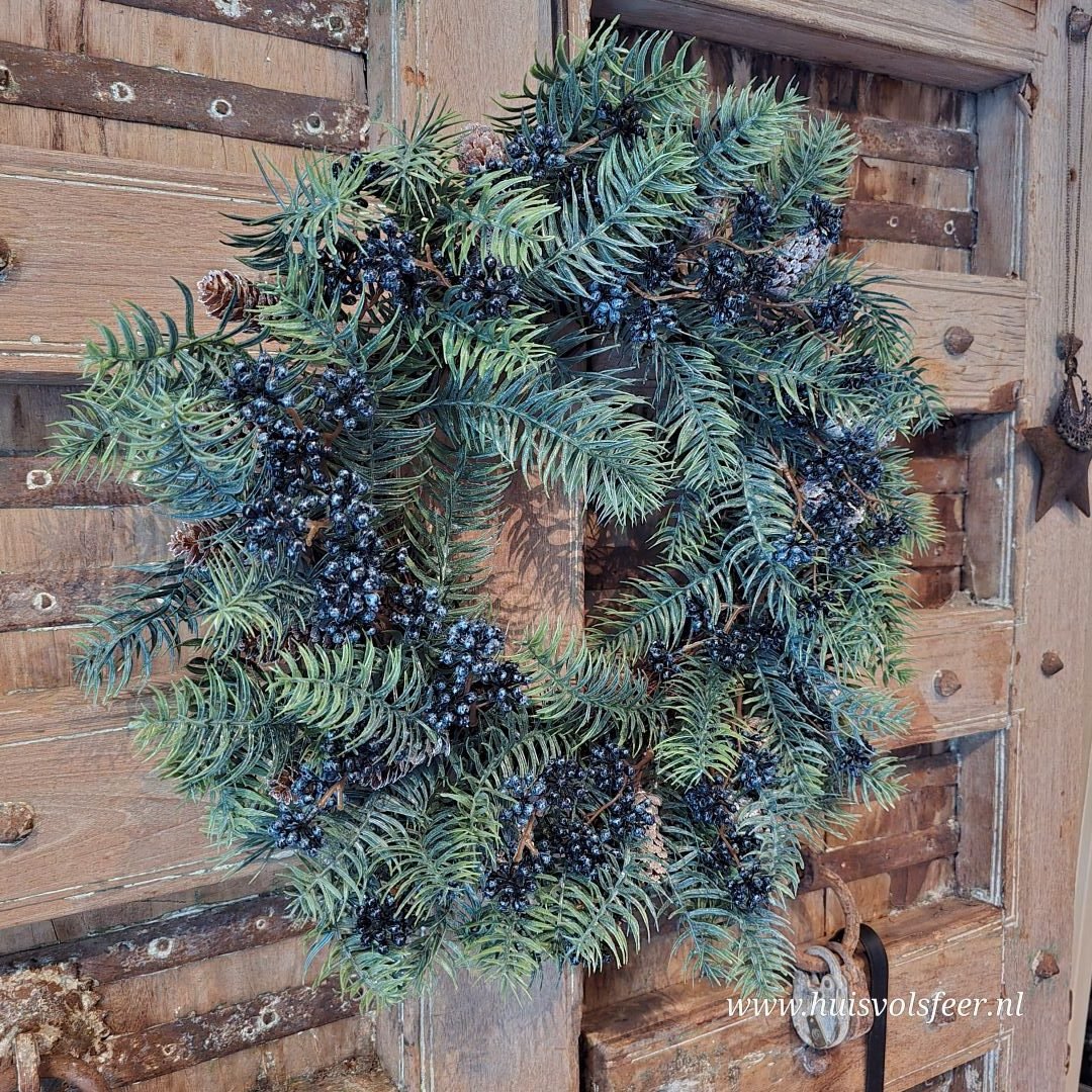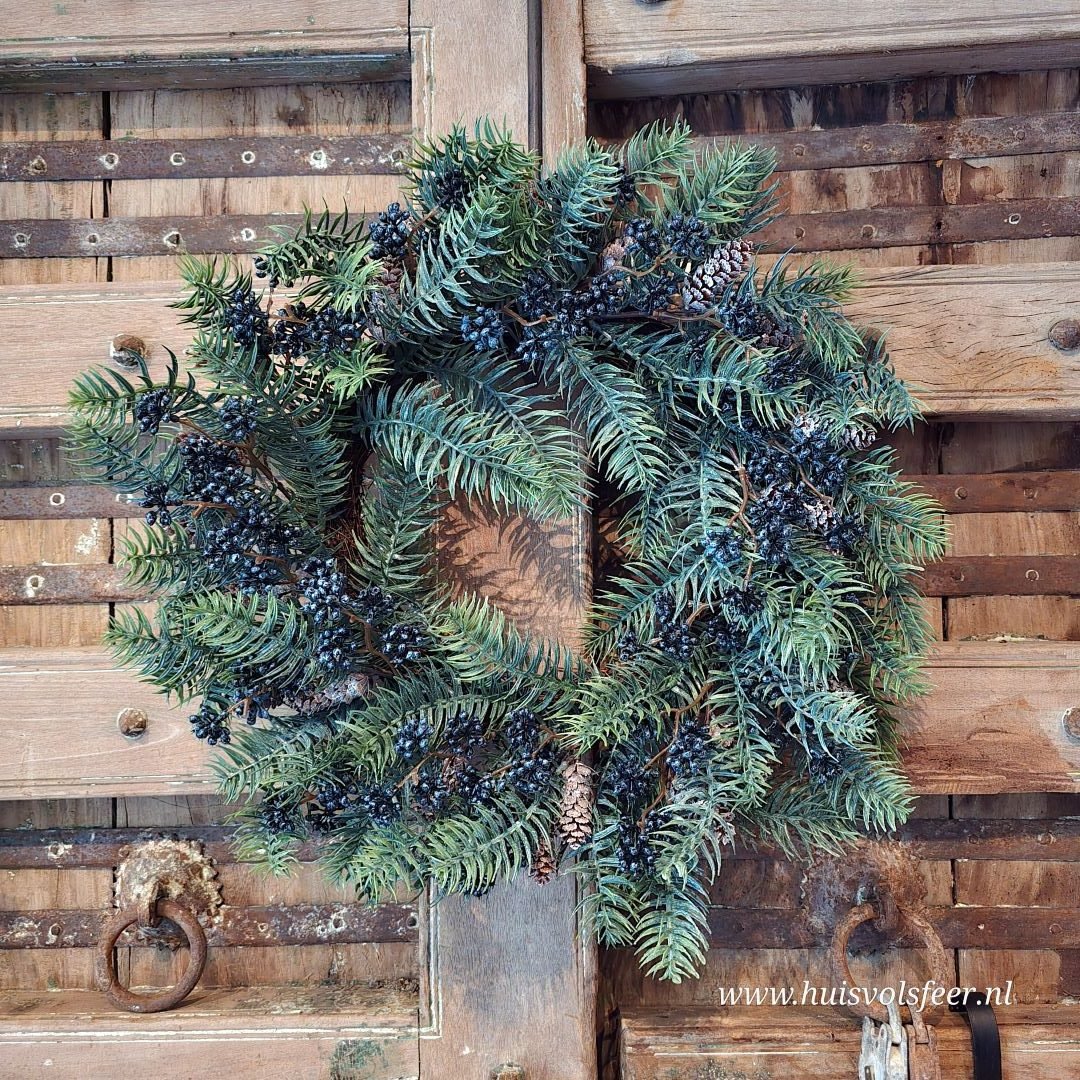 Een prachtige en royale krans van kunst dennegroen, versierd met blauwe bessen en kleine dennenappels. Deze groene kunstkrans met blauwe bes straalt een natuurlijke charme uit die perfect past binnen een landelijke, sobere of botanische woonstijl. De krans is gemaakt van hoogwaardig kunstgroen (zijde) en heeft een rijke, volle uitstraling — ideaal voor het najaar, winter én kerst.