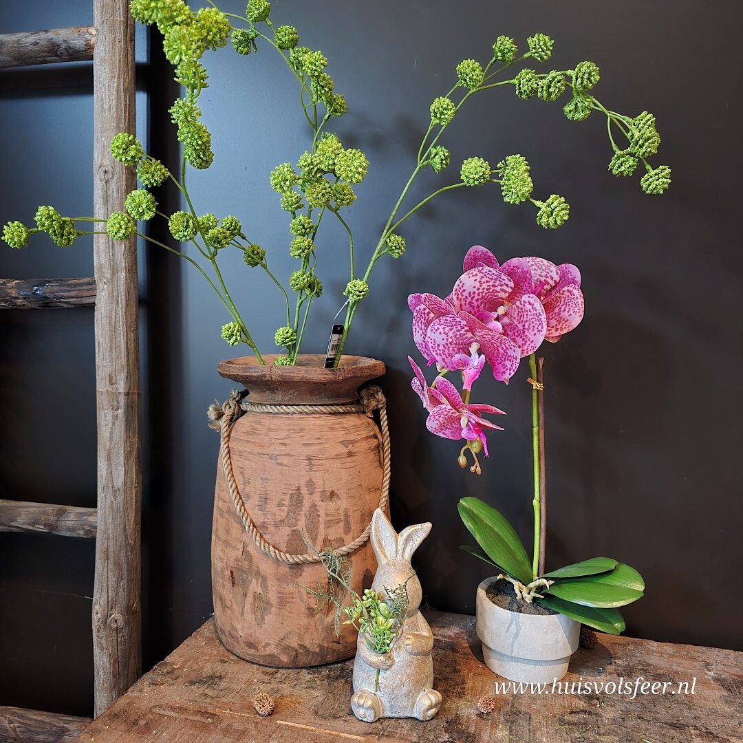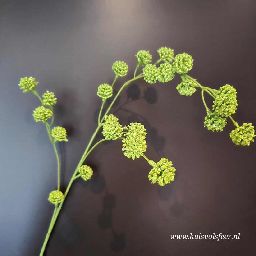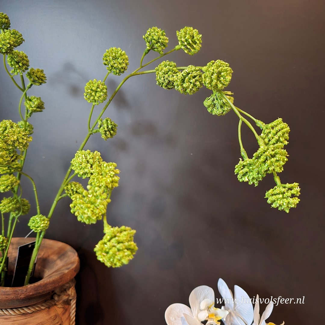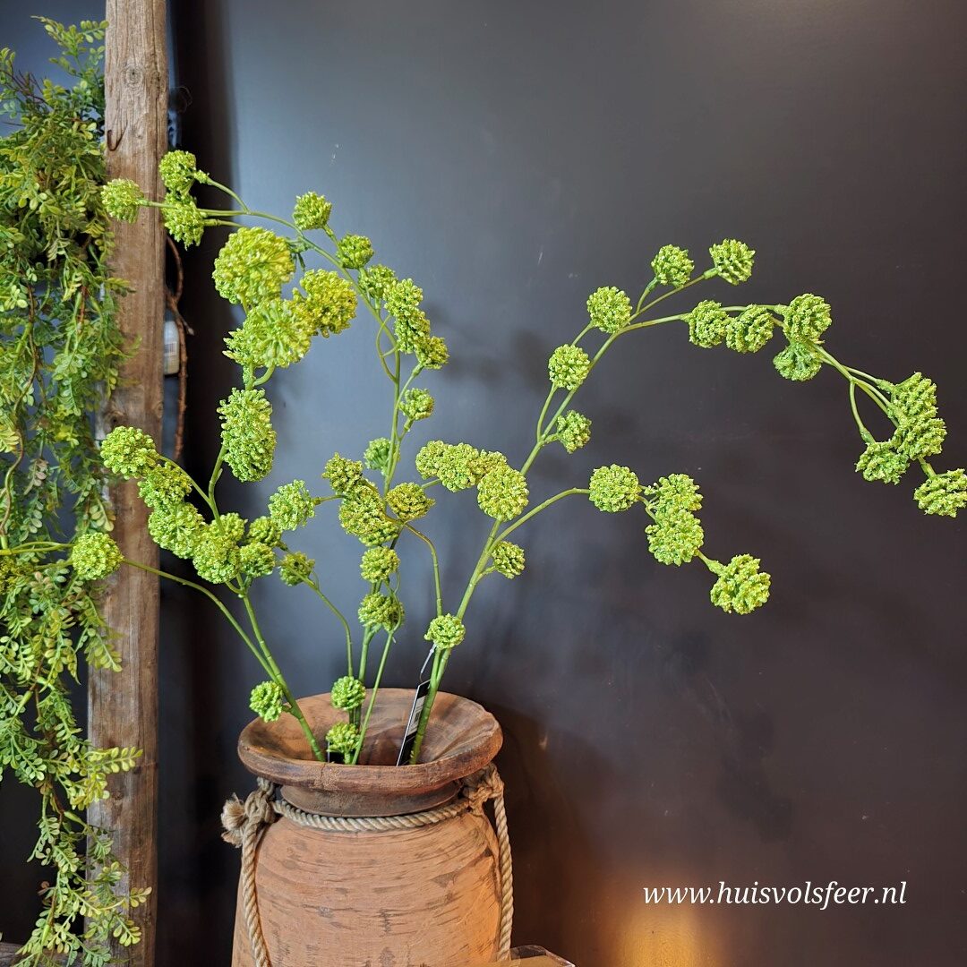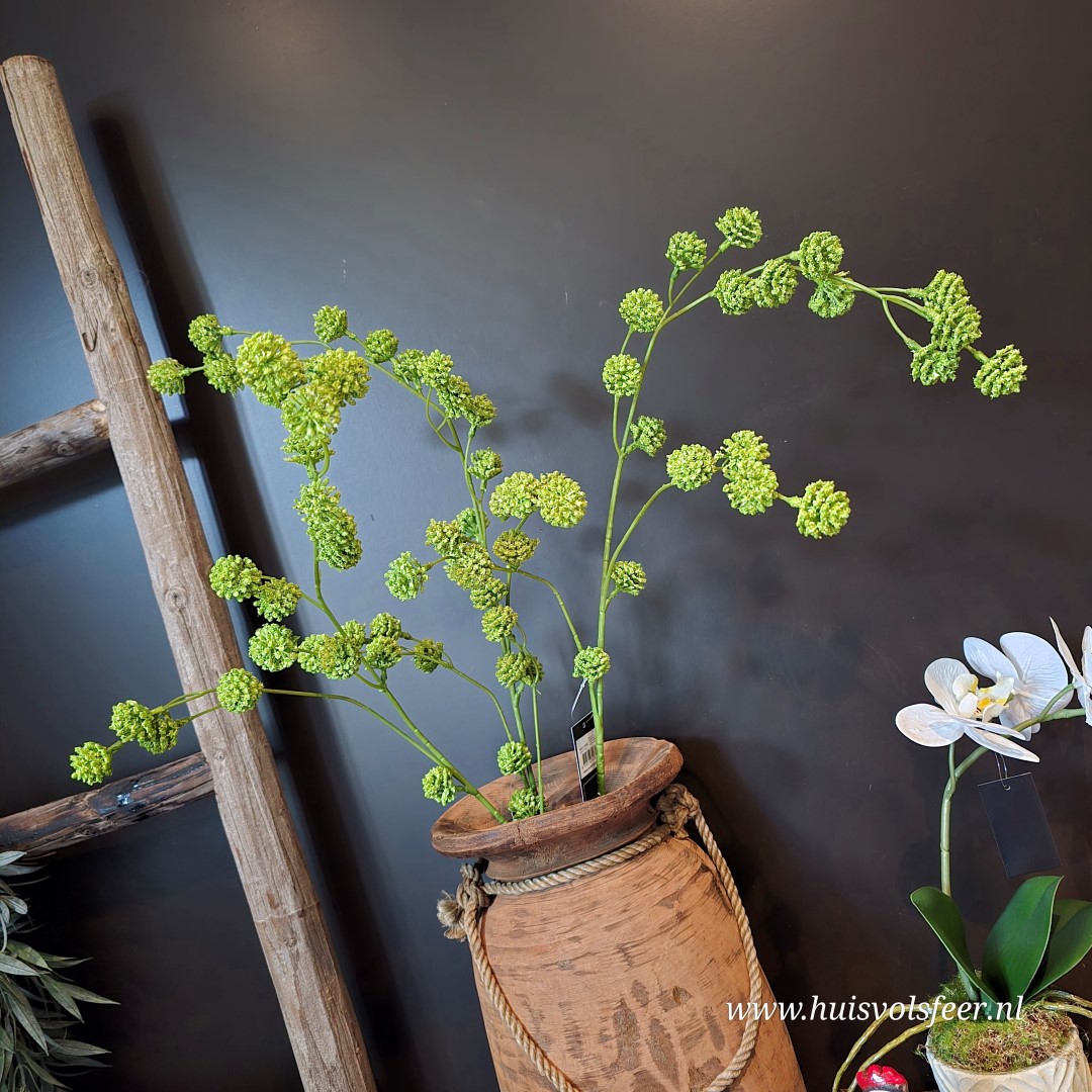 De Trifolium zijdetak, ook wel sier klaver genoemd, heeft een speelse en natuurlijke uitstraling dankzij de fijne bolvormige bloei en de natuurlijke groene tinten. De lange, sierlijk vertakkende steel geeft hoogte en beweging aan een vaas en past perfect binnen een rustig, landelijk of botanisch interieur. Ideaal als solotak in een smalle vaas of gecombineerd met andere kunstbloemen voor een luchtig arrangement.