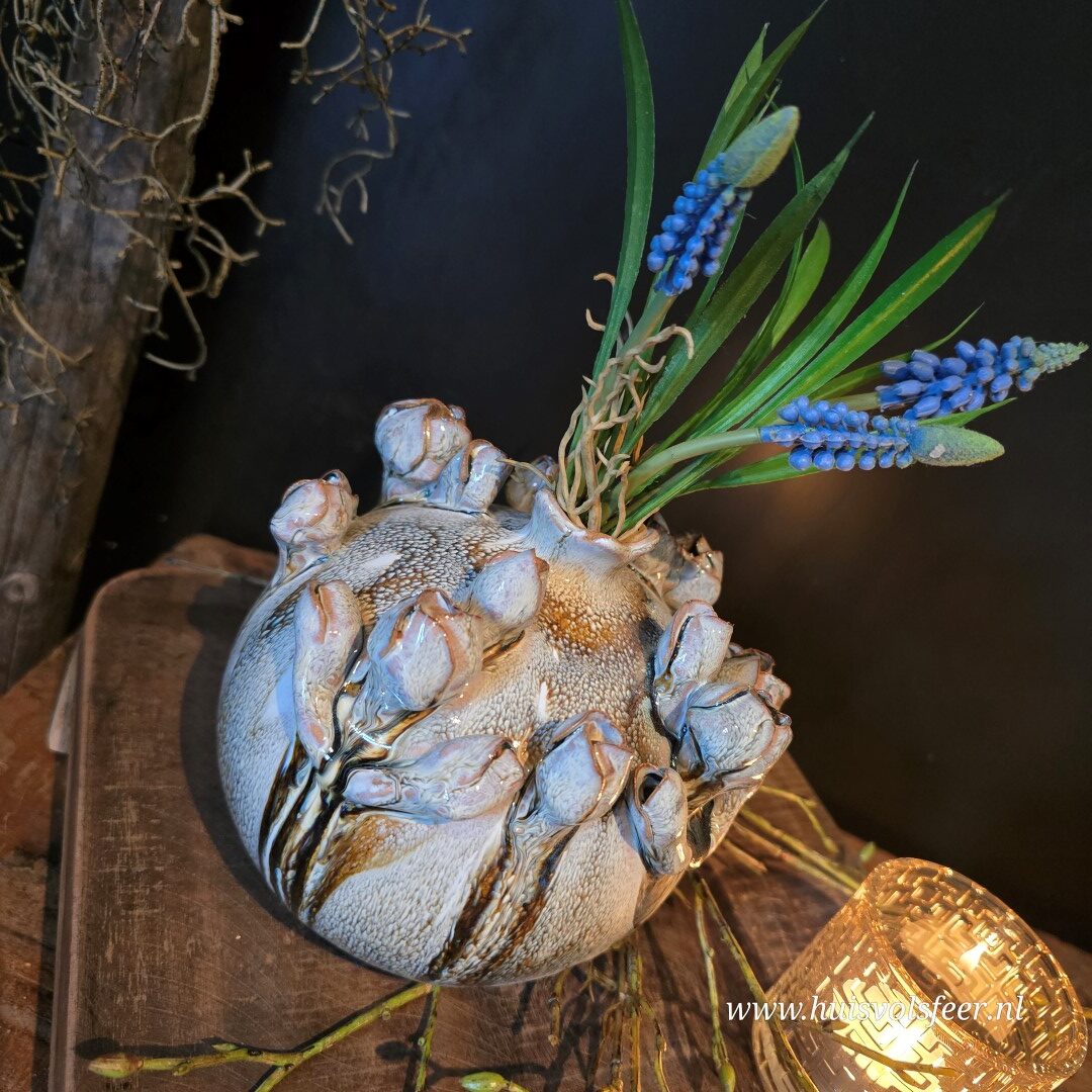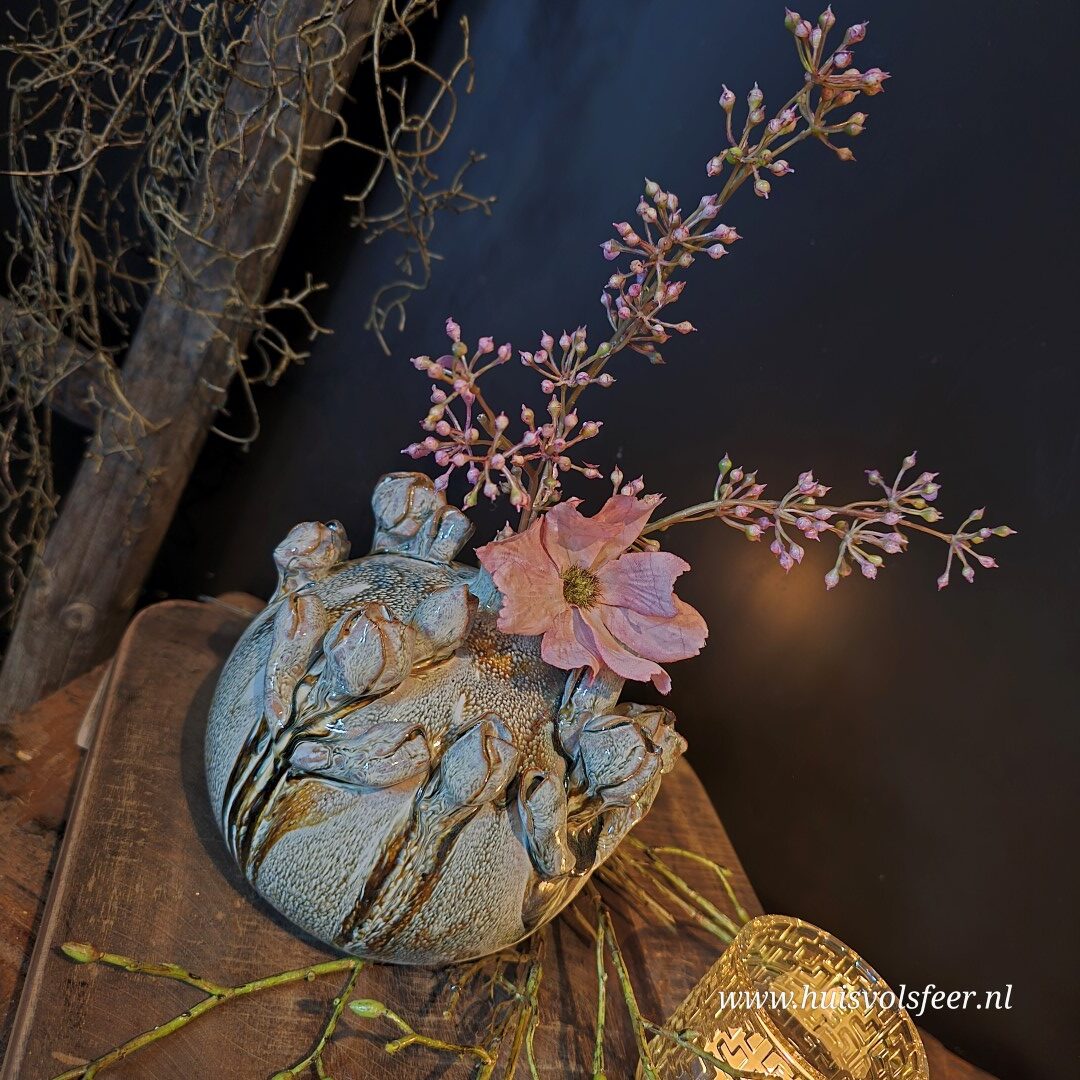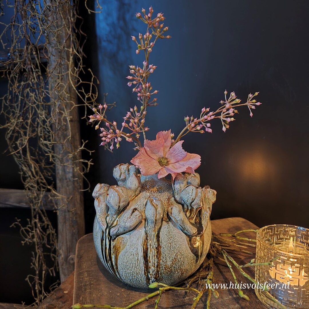 Omdat het een handgemaakt item betreft, kunnen kleine oneffenheden, kleurverschillen en imperfecties voorkomen. Dit draagt bij aan de unieke en karaktervolle uitstraling van de vaas.