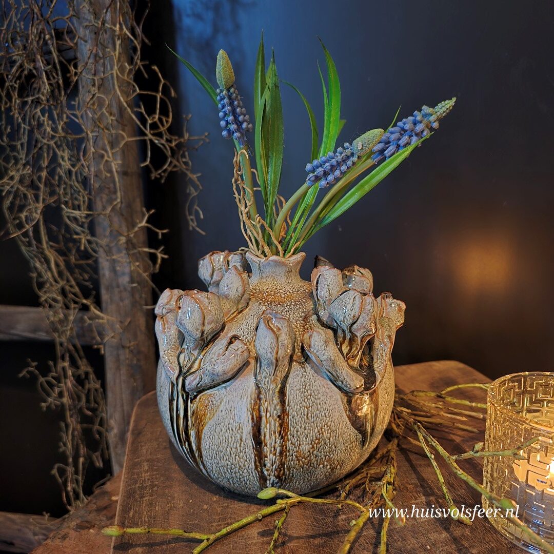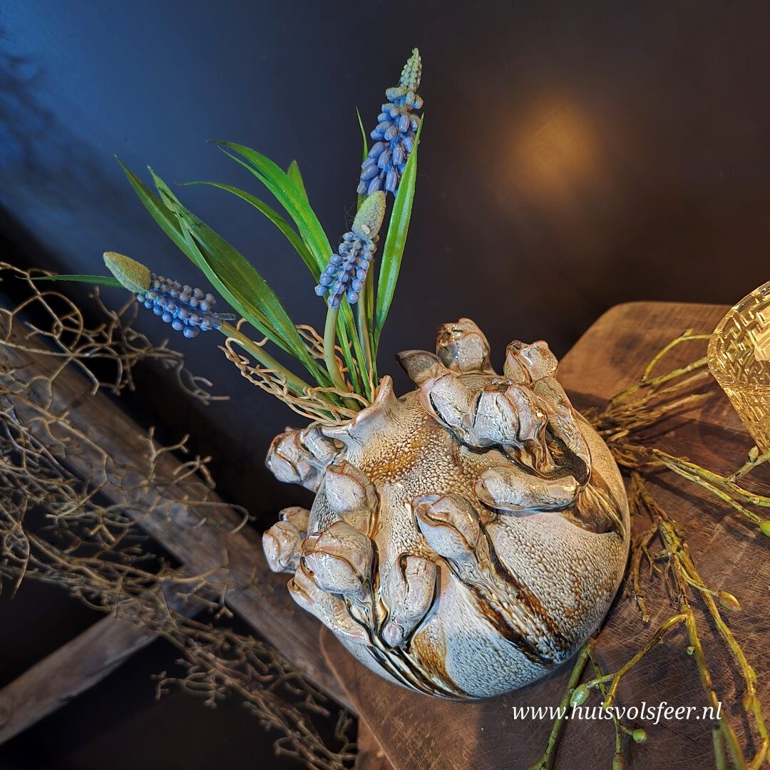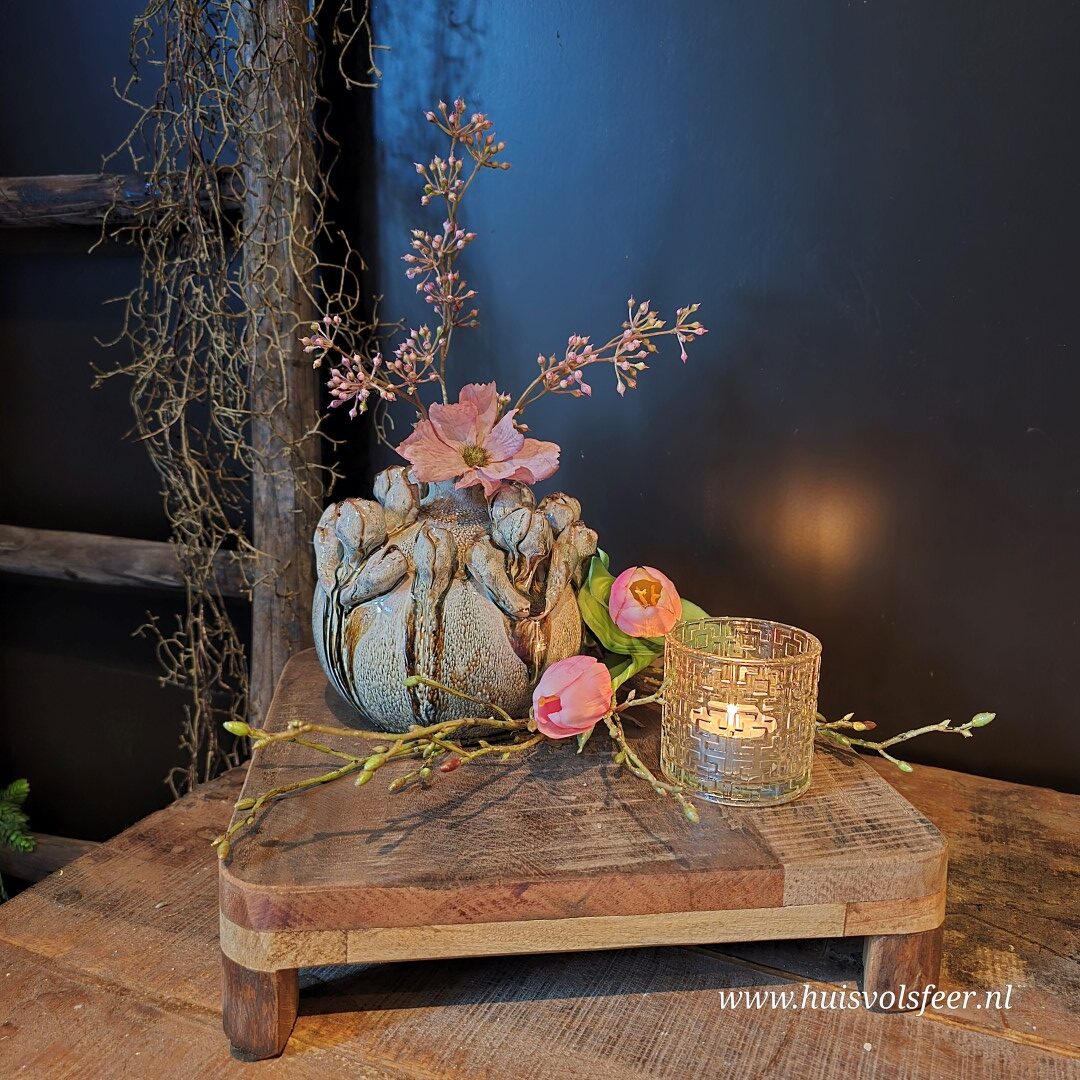 Omdat het een handgemaakt item betreft, kunnen kleine oneffenheden, kleurverschillen en imperfecties voorkomen. Dit draagt bij aan de unieke en karaktervolle uitstraling van de vaas.