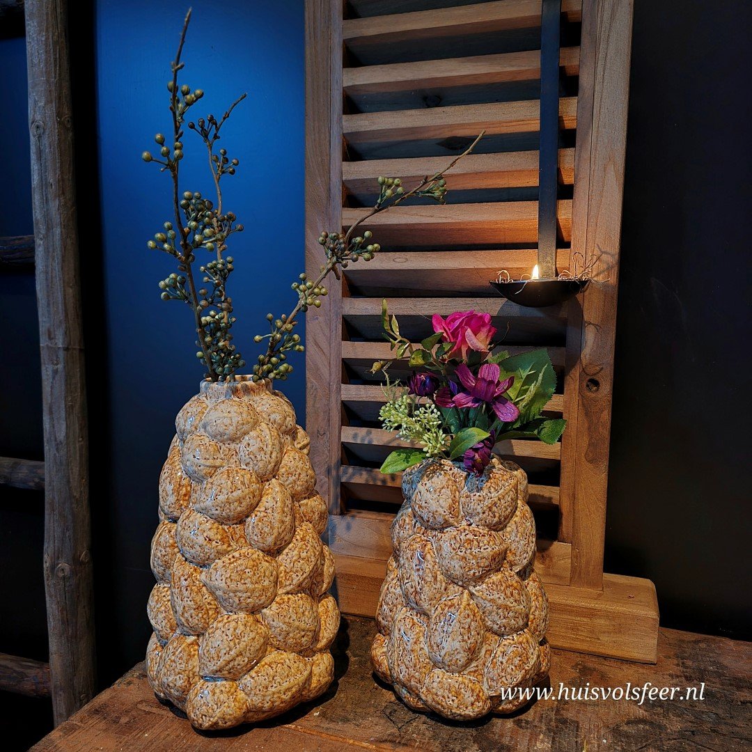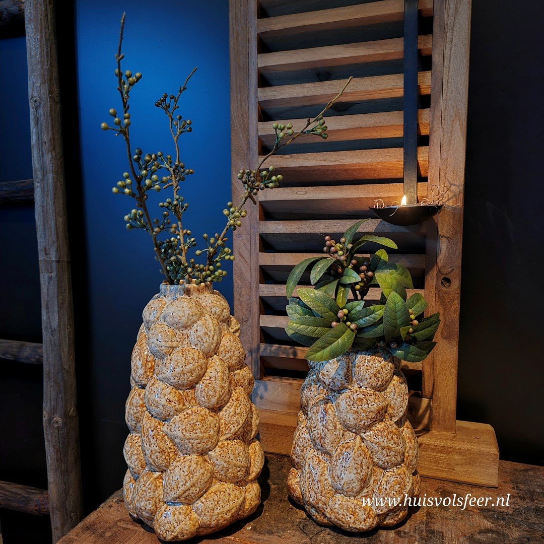 De vaas is volledig gemaakt van porselein, met een verfijnde afwerking van walnootvormige details die rondom de vaas zijn aangebracht. Het unieke ontwerp creëert een opvallende textuur en een warme, natuurlijke uitstraling.