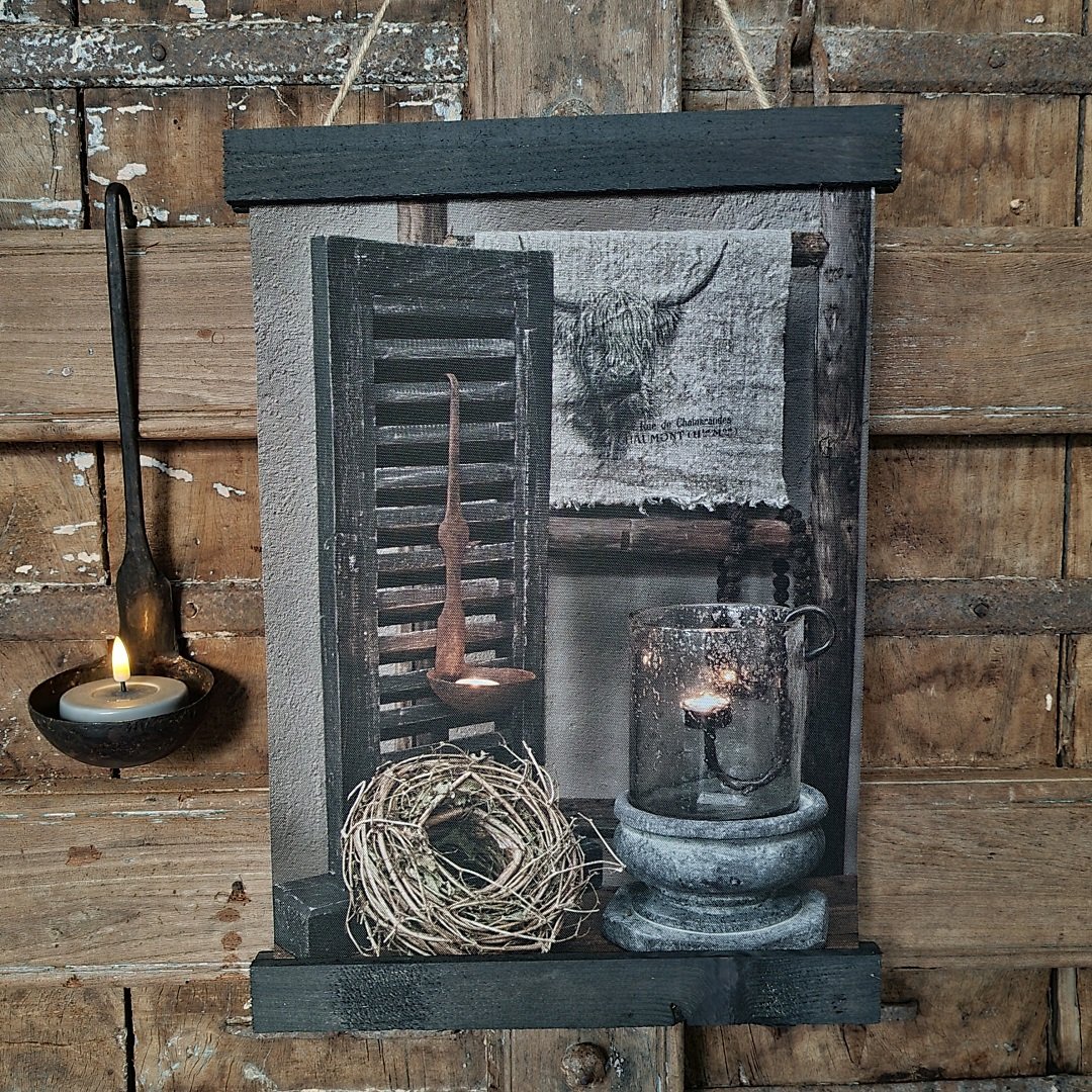 Prachtig wanddoek met een afbeelding van een sfeervol geheel; een stoer luikje, bubbelglas op een poer met een brandend kaarsje, shabby doek hooglander en een krans.