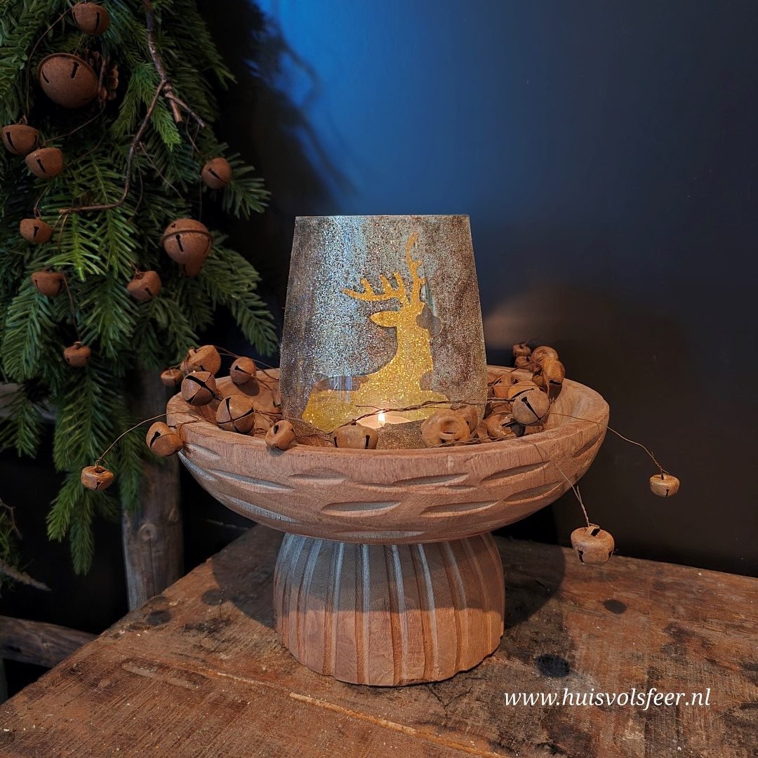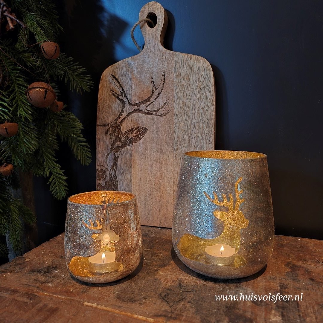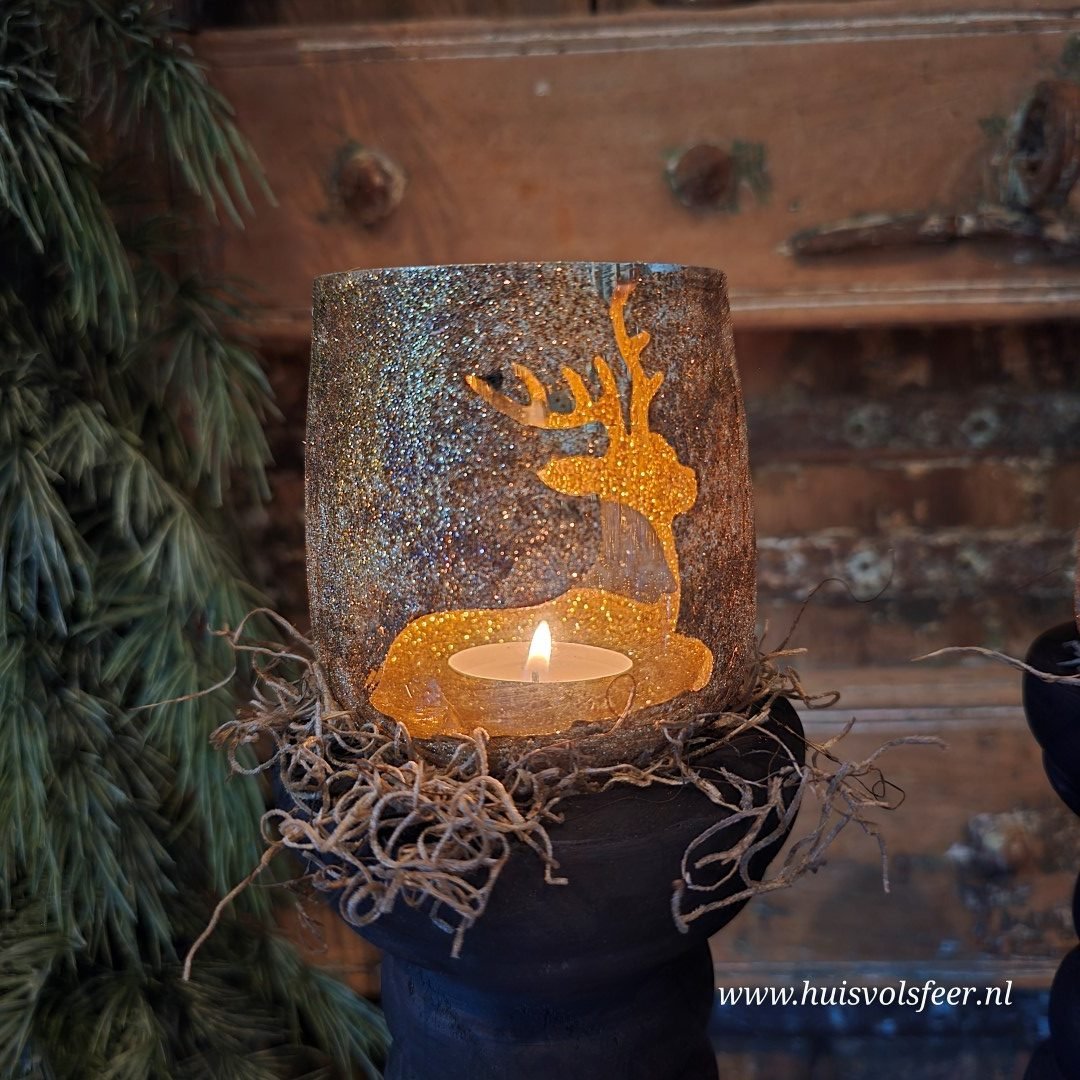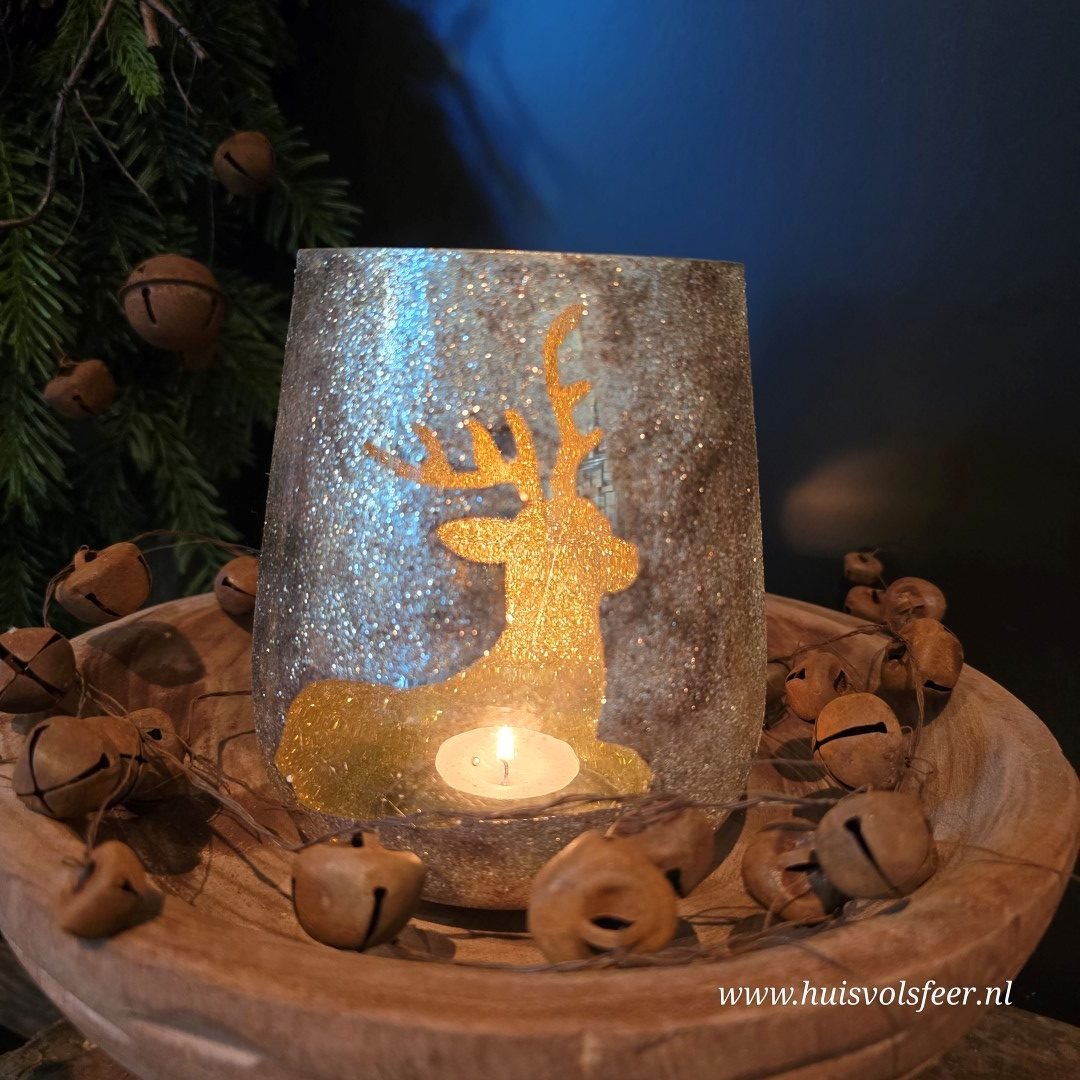 Deze prachtige waxinelichthouder in antiek goud straalt warmte en elegantie uit. Het glas is voorzien van een fonkelende rendierprint, waardoor het kaarslicht een sfeervol en speels schaduwspel creëert. Met zijn royale afmeting van 13xH15 cm is dit windlicht perfect als blikvanger op tafel, dressoir of in de vensterbank. Combineer hem met kleinere theelichthouders of plaats hem op een plateau met wat groen, mos of kerstdecoratie voor een extra feestelijk geheel.