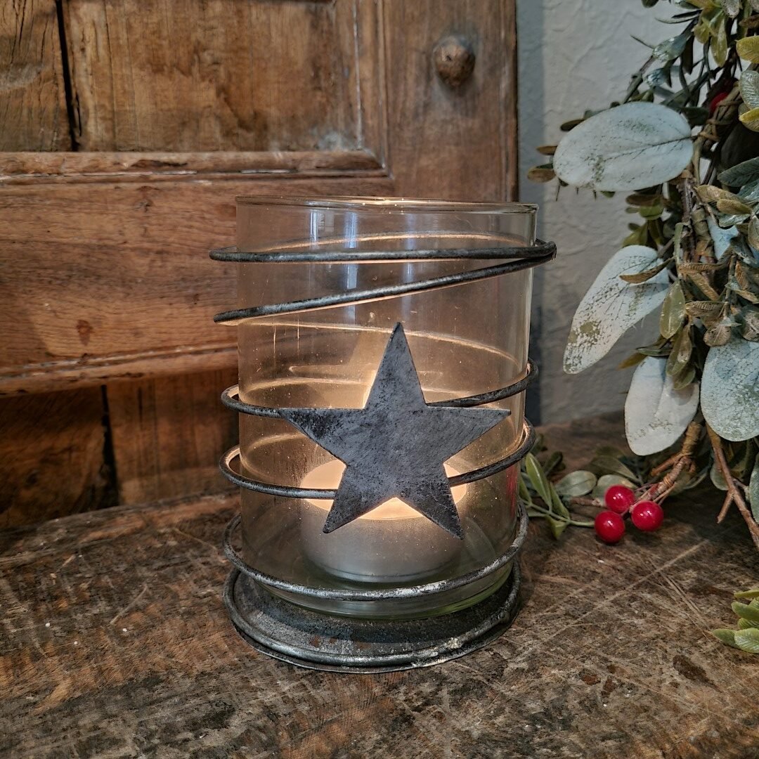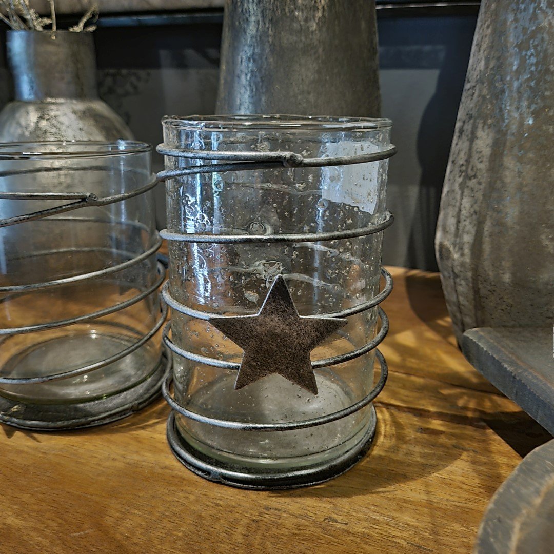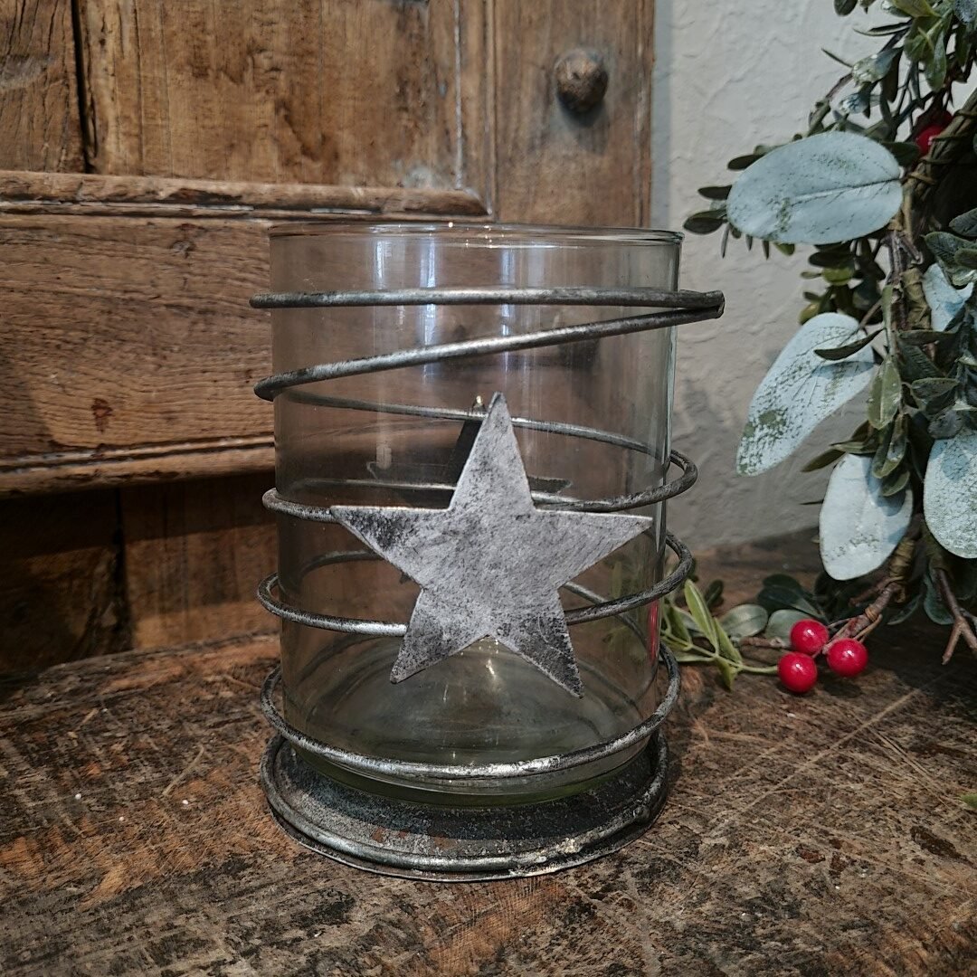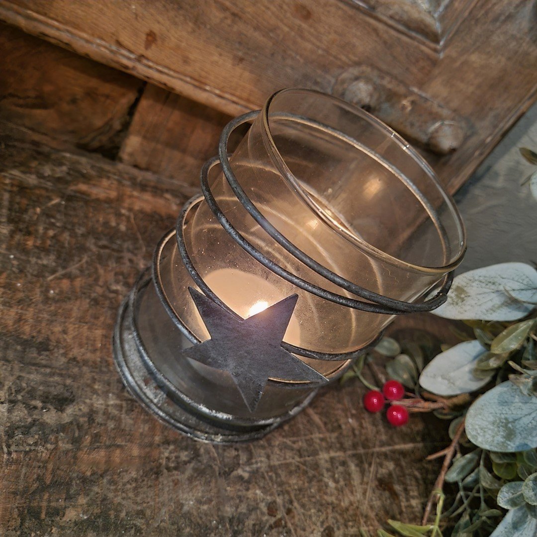 Waxinelichthouder/ theelichthouder van glas met rondom een metalen spiraal met een ster.
