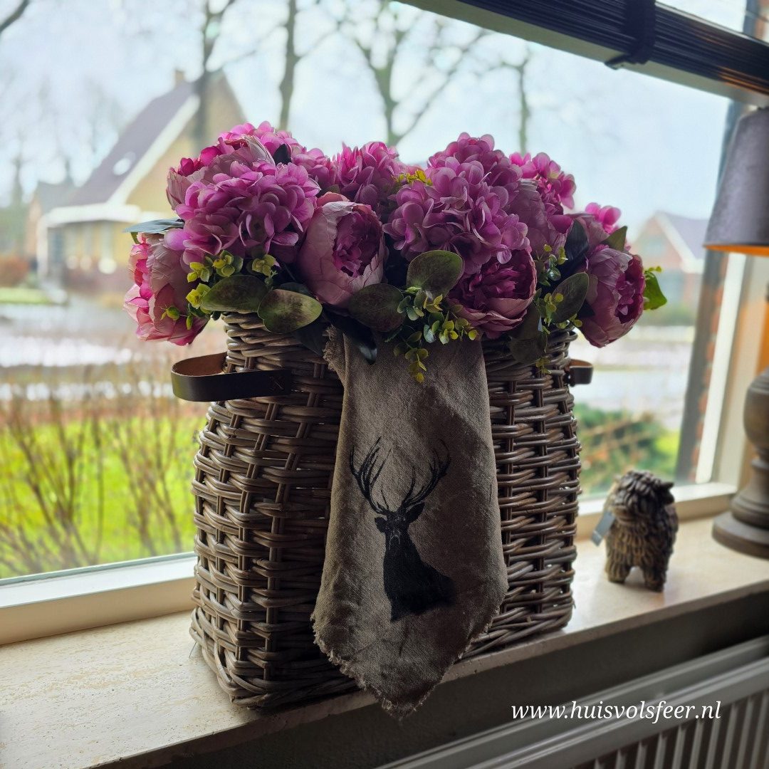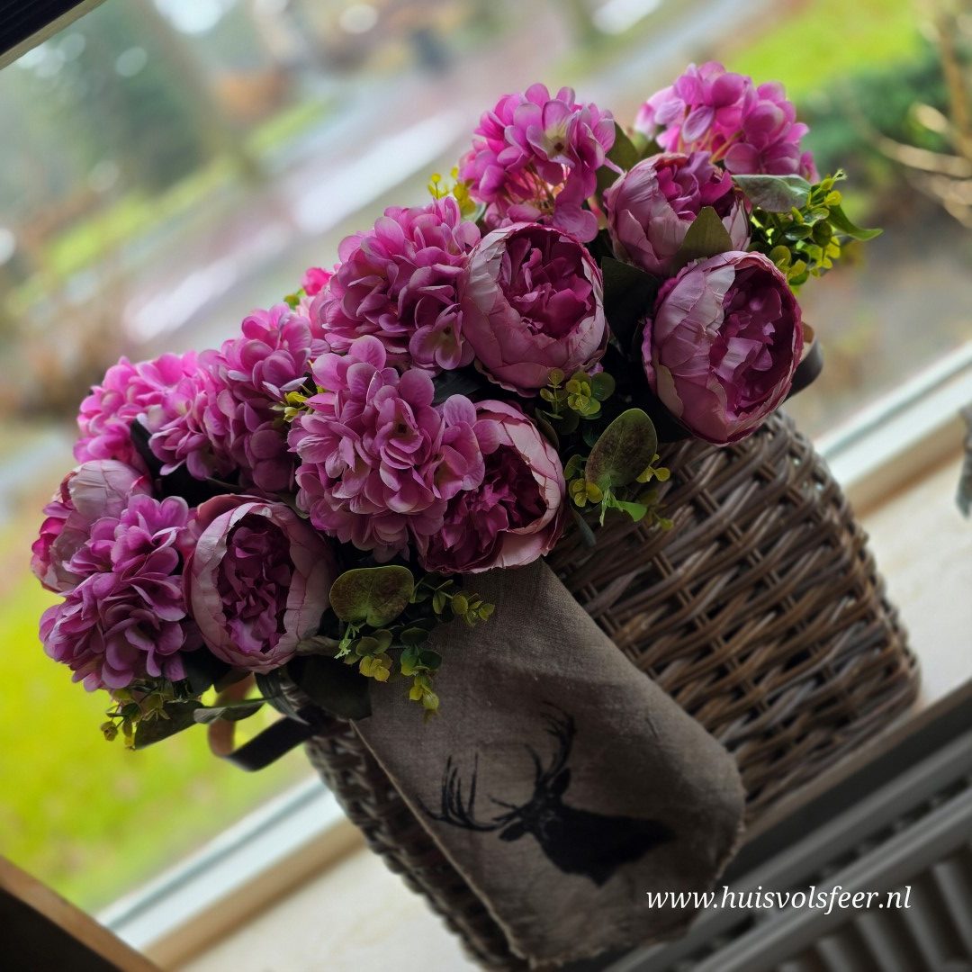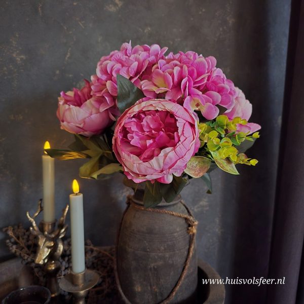 Vol en sfeervol kunstboeket in een warme oudroze tint, samengesteld uit pioenrozen, hortensia’s en fris groen blad. Dit zijdeboeket is kant-en-klaar en hoeft alleen nog in een vaas gezet te worden voor direct een stijlvolle en natuurlijke uitstraling in huis.